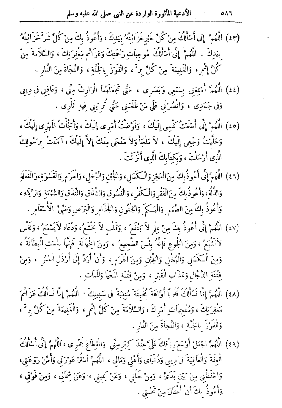 (43) اللَّهُمَّ إِنِّي أَسْأَلُكَ مِنْ كُلِّ خَيْرٍ خَزَائِنُهُ بِيَدِكَ، وَأَعُوذُ بِكَ مِنْ كُلِّ شَرٍّ خَزَائِنُهُ بِيَدِكَ. اللَّهُمَّ إِنِّي أَسْأَلُكَ مُوجِبَاتِ رَحْمَتِكَ وَعَزَائِمَ مَغْفِرَتِكَ، وَالسَّلامَةَ مِنْ كُلِّ إِثْمٍ، والْغَنِيمَةَ مِنْ كُلِّ بِرٍّ، والْفَوْزَ بِالْجَنَّةِ، والنَّجَاةَ مِنَ النَّارِ.