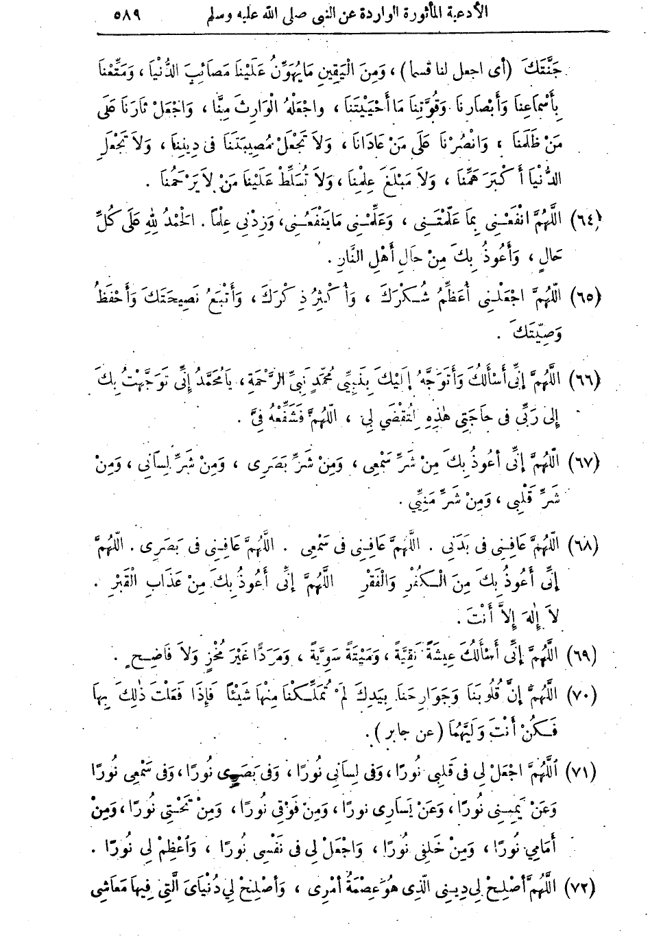 (71) اللَّهُمَّ اجْعَلْ لِي في قَلْبِي نُوراً، وَفي لِسَانِي نُوراً، وفي بَصَرِي نُوراً، وَفي سَمْعِي نُوراً وَعَنْ يَمِينِي نُوراً، وَعَنْ يَسَارِي نُوراً، وَمِنْ فَوْقِي نُوراً، وَمِنْ تَحْتِي نُوراً، وَمِنْ أَمَامِي نُوراً، وَمِنْ خَلْفِي نُوراً، وَاجْعَلْ لِي في نَفْسِي نُوراً، واعْظِمْ لِي نُوراً.