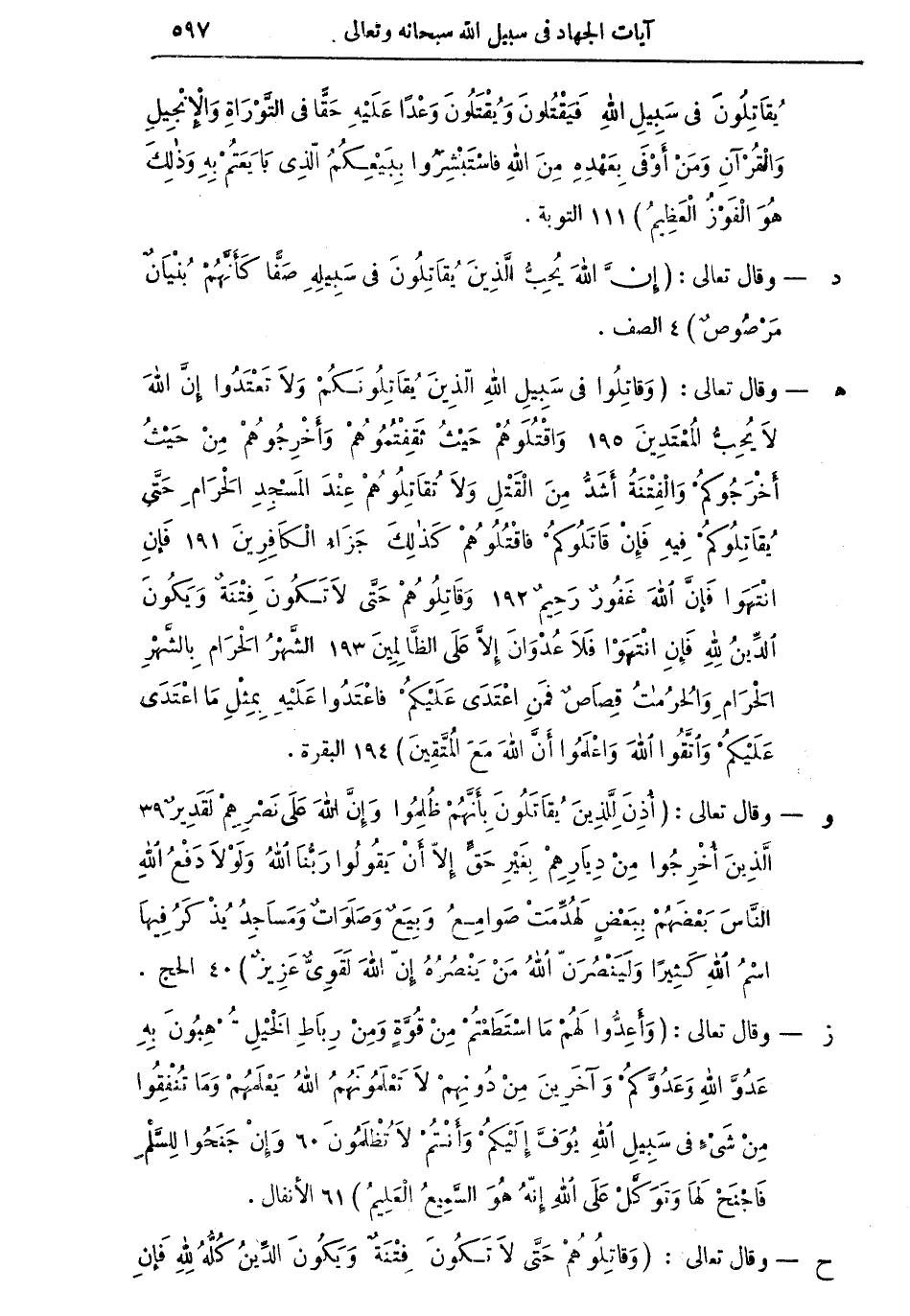 هـ - وقال تعالى: [وَقاتِلُوا في سَبِيلِ اللهِ الَّذِينَ يُقَاتِلُونَكُمْ ولا تَعْتَدُوا إِنَّ اللهَ لا يُحِبُّ الْمُعْتَدِينَ (190) واقْتُلُوهُمْ حَيْثُ ثَقِفْتُمُوهُمْ وأَخْرِجُوهُمْ مِنْ حَيْثُ أَخْرَجُوكُمْ وَالْفِتْنَةُ أَشَدُّ مِنَ الْقَتْلِ وَلا تُقَاتِلُوهُمْ عِنْدَ الْمَسْجِدِ الْحَرَامِ حَتَّى يُقَاتِلُوكُمْ فِيهِ فَإِنْ قَاتَلُوكُمْ فاقْتُلُوهُمْ كَذَلِكَ جَزَاءُ الْكَافِرِينَ (191) فَإِنْ انْتَهَوْا فَإِنَّ اللهَ غَفُورٌ رَحِيمٌ (192) وَقَاتِلُوهُمْ حَتَّى لاَ تَكُونَ فِتْنَةٌ وَيَكُونَ الدِّينُ للهِ فَإِنِ انْتَهَوْا فَلا عُدْوَانَ إِلاَّ عَلَى الظَّالِمِينَ (193) الشَّهْرُ الْحَرَامُ بِالشَّهْرِ الْحَرَامِ والْحُرُمَاتُ قِصَاصٌ فَمَنِ اعْتَدَى عَلَيْكُمْ فاعْتَدُوا عَلَيْهِ بِمِثْلِ مَا اعْتَدَى عَلَيْكُمْ واتَّقُوا اللهَ واعْلَمُوا أَنَّ اللهَ مَعَ الْمُتَّقِينَ (194)] البقرة.