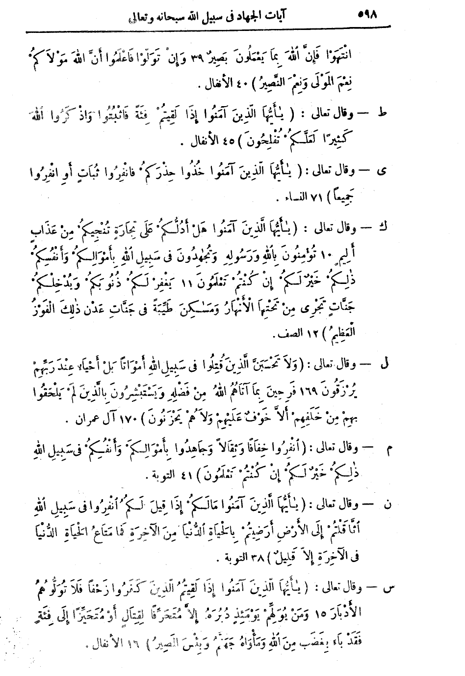 س - وقال تعالى: يا أَيُّهَا الَّذِينَ آمَنُوا إِذَا لَقِيتُمُ الَّذِينَ كَفَرُوا زَحْفاً فلا تُوَلُّوهُمُ الأَدْبَارَ (15) وَمَنْ يُوَلِّهِمْ يُوْمَئِذٍ دُبُرَهُ إِلاَّ مُتَحَرِّفاً لِقِتَالٍ أَوْ مُتَحَيِّزاً إِلى فِئَةٍ فَقَدْ بَاءَ بِغَضَبٍ مِنَ اللهِ وَمَأْوَاهُ جَهَنَّمُ وَبِئْسَ الْمَصِيرُ (16)] الأنفال.