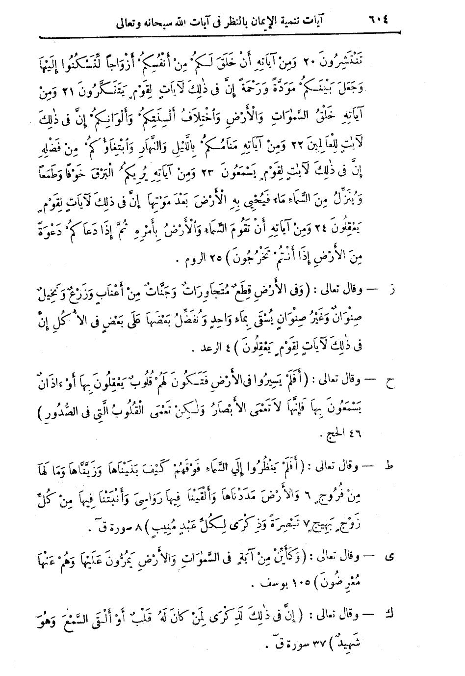 ي - وقال تعالى: [وَكَأَيِّنْ مِنْ آيَةٍ في السَّمَواتِ والأَرْضِ يَمُرُّونَ عَلَيْهَا وَهُمْ عَنْهَا مُعْرِضُونَ (105)] يوسف.