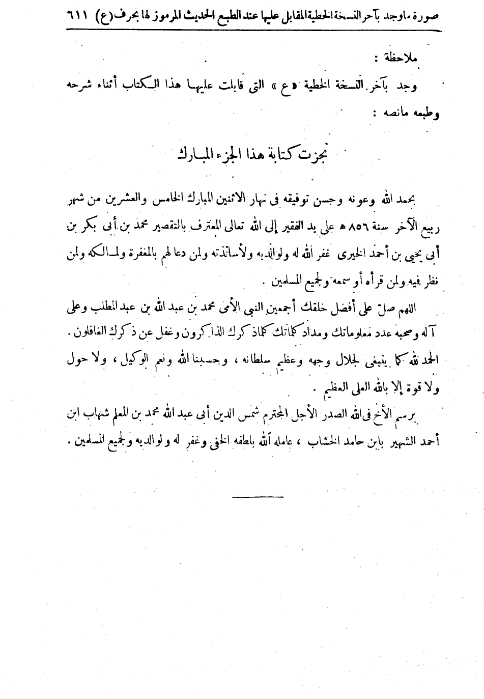 بحمد الله وعونه وحسن توفيقه في نهار الاثنين المبارك الخامس والعشرين من شهر ربيع الآخر سنة 856 هـ على يد الفقير إلى الله تعالى المعترف بالتقصير محمد بن أبي بكر بن أبي يحيى بن أحمد الخيري غفر الله له ولوالديه ولأساتذته ولمن دعا لهم بالمغفرة ولمالكه ولمن نظر فيه ولمن قرأه أو سمعه ولجميع المسلمين.