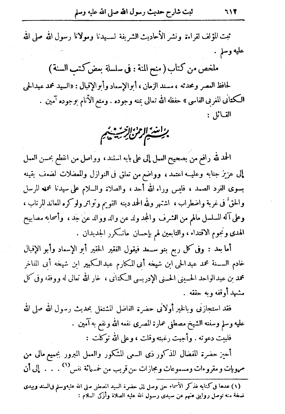 أما بعد: وفي كل ربع بنو سعد فيقول الفقير الحقير أبو الإسعاد وأبو الإقبال خادم السنة محمد عبد الحي ابن شيخه أبي المكارم عبد الكبير ابن شيخه أبي المفاخر محمد بن عبد الواحد الحسيني الحسني الإدريسي الكتاني، خار الله تعالى له ووفقه وفي كل مشهد أوقفه ربه حققه.