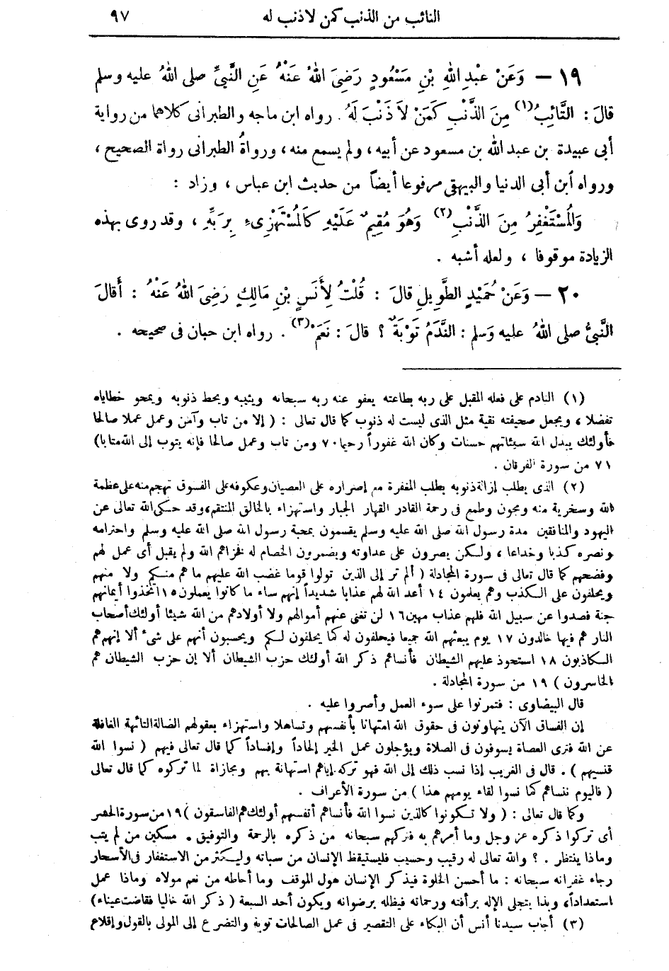 20 - وَعَنْ حُمَيْدٍ الطَّوِيلِ قالَ: قُلْتُ لأَنَسِ بْنِ مَالِكٍ رَضِيَ اللهُ عَنْهُ: أَقالَ النَّبِيُّ صلى اللهُ عليه وسلم: النَّدَمُ تَوْبَةٌ؟ قالَ: نَعَمْ (¬3). رواه ابن حبان في صحيحه.