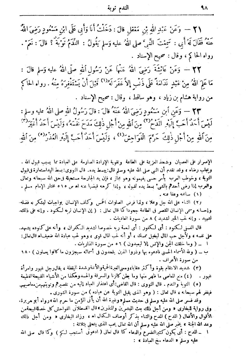 (¬5) التوبة والندم. قال النووي: قال القاضي: أي اعتذار العباد إليه من تقصيرهم وتوبتهم من معاصيهم فيغفر لهم سبحانه، قال تعالى: [وهو الذي يقبل التوبة عن عباده] من سورة الشورى.