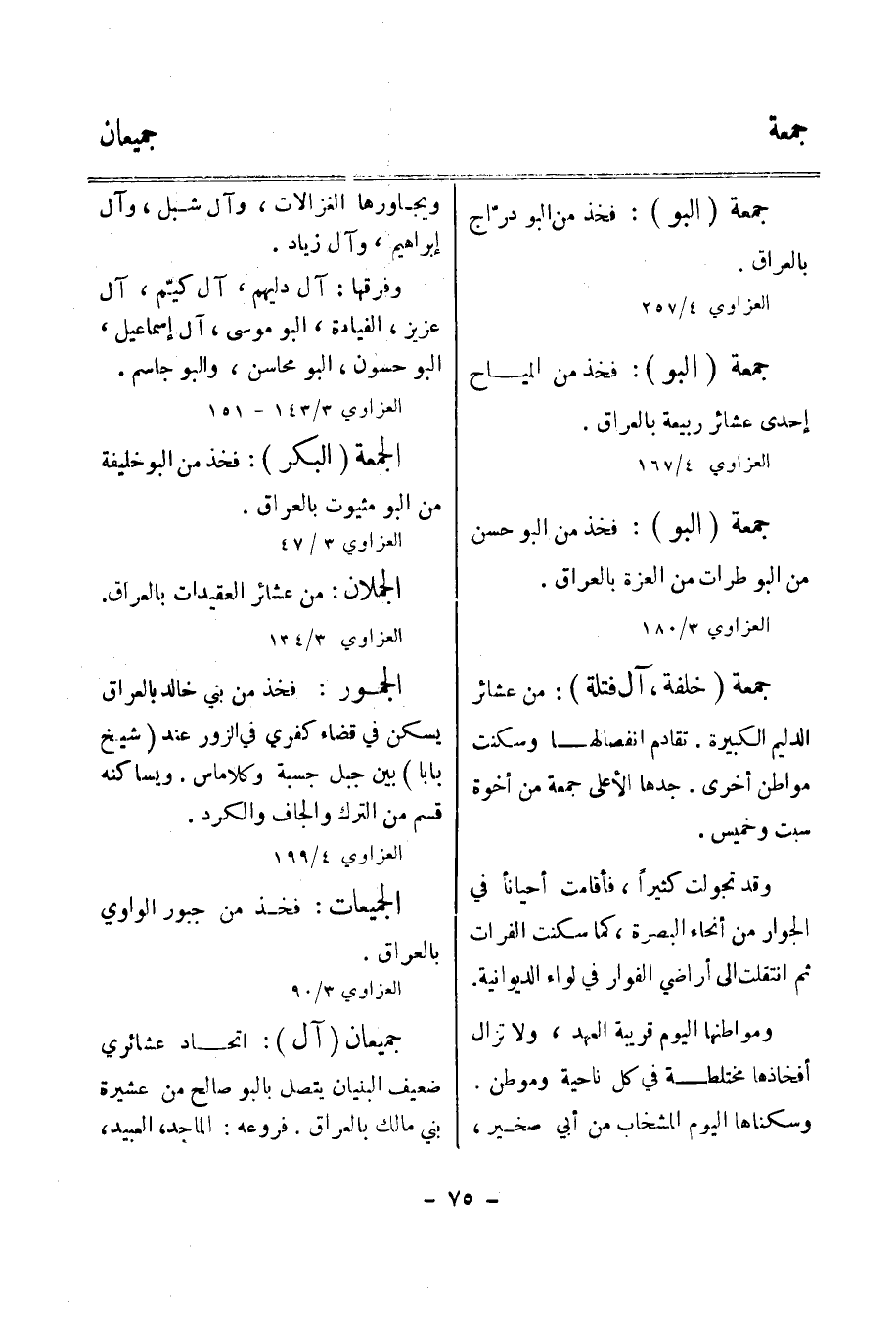 وفرقها: آل دليهم، آل كيّم، آل عزيز، الفيادة، البو موسى، آل إسماعيل، البو حسون، البو محاسن، والبو جاسم.