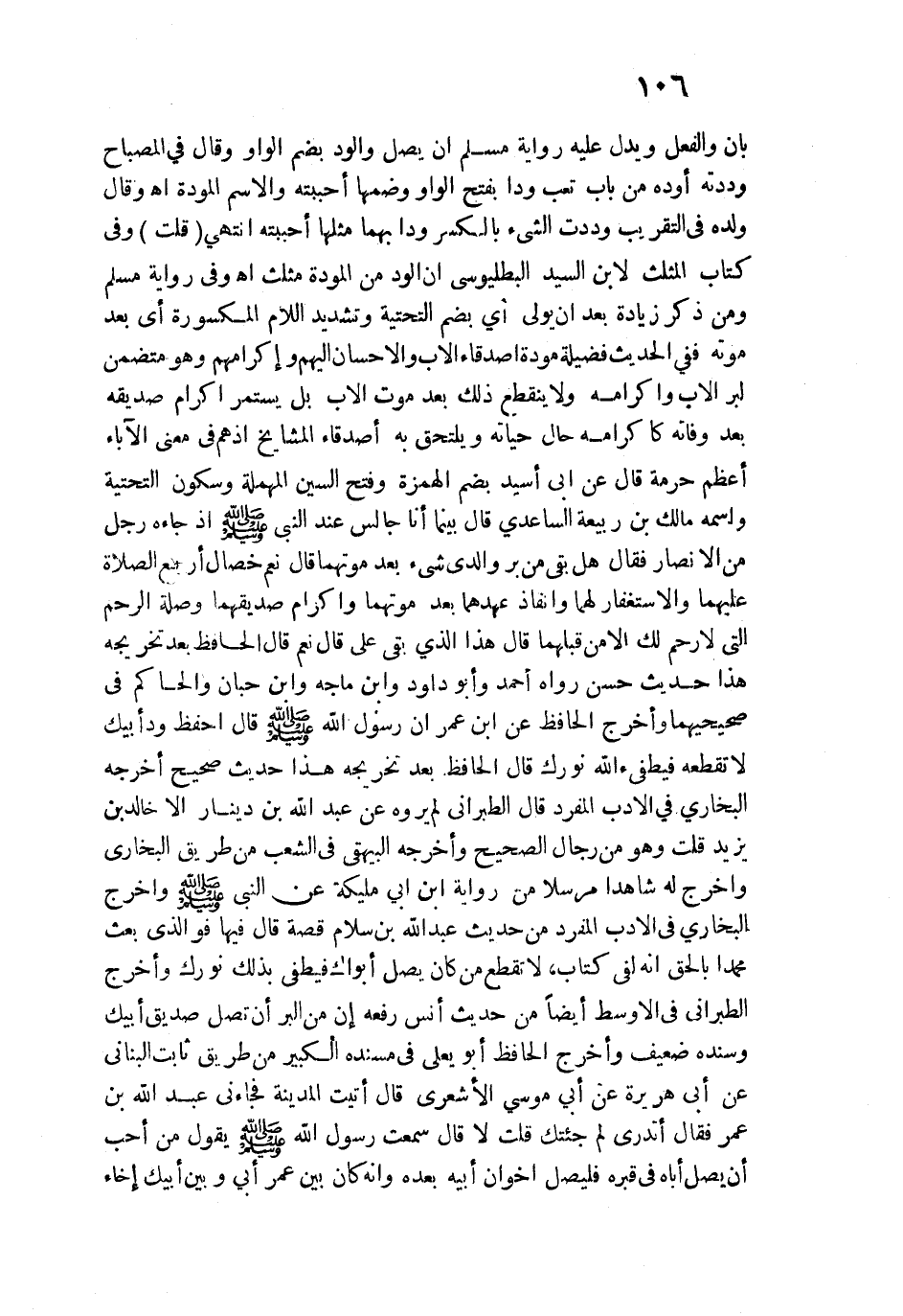 هم في معنى الآباء أعظم حرمة قال عن أبي أسيد بضم الهمزة وفتح السين المهملة وسكون التحتية واسمه مالك بن ربيعة الساعدي قال بينما أنا جالس عند النبي - صلى الله عليه وسلم - إذ جاءه رجل من الأنصار فقال هل بقي من بر والدي شيء بعد موتهما قال نعم خصال أربع الصلاة عليهما والاستغفار لهما وإنفاذ عهدهما بعد موتهما وإكرام صديقهما وصلة الرحم التي لا رحم لك إلَّا من قبلهما قال هذا الذي بقي علي قال نعم قال الحافظ بعد تخريجه هذا حديث حسن رواه أحمد وأبو داود وابن ماجة وابن حبان والحاكم في صحيحيهما وأخرج الحافظ عن ابن عمر إن رسول الله - صلى الله عليه وسلم - قال احفظ ود أبيك لا تقطعه فيطفئ الله نورك قال الحافظ بعد تخريجه هذا حديث صحيح أخرجه البخاري في الأدب المفرد قال الطبراني لم يروه عن عبد الله بن دينار إلا خالد بن يزيد قلت وهو من رجال الصحيح وأخرجه البيهقي في الشعب من طريق البخاري وأخرج له شاهدًا مرسلًا من رواية ابن أبي مليكة عن النبي - صلى الله عليه وسلم - وأخرج البخاري في الأدب المفرد من حديث عبد الله بن سلام قصة قال فيها فوالذي بعث محمدًا بالحق إنه لفي كتاب، لا تقطع من كان يصل أبوابك فيطفئ بذلك نورك وأخرج الطبراني في الأوسط أيضًا من حديث أنس رفعه إن من البر أن تصل صديق أبيك وسنده ضعيف وأخرج الحافظ أبو يعلى في مسنده الكبير من طريق ثابت البناني عن أبي هريرة عن أبي موسى الأشعري قال أتيت المدينة فجاءني عبد الله بن عمر فقال أتدري لم جئتك قلت لا قال سمعت رسول الله - صلى الله عليه وسلم - يقول من أحب أن يصل أباه في قبره فليصل إخوان أبيه بعده وإنه كان بين عمر أبي وبين أبيك إخاء