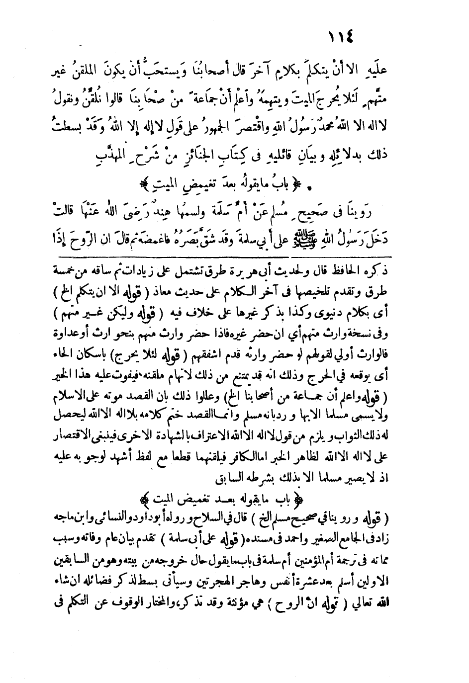 قوله: (وَرَوَيْنَا في صَحيحِ مُسلم الخ) قال فيِ السلاح ورواه أبو داود والنسائي وابن ماجة زاد في الجامع الصغير وأحمد في مسنده. قوله: (عَلَى أبِي سلمَةَ) تقدم بيان عام وفاته وسبب مماته في ترجمة أم المؤمنين أم سلمة في باب ما يقول حال خروجه من بيته وهو من السابقين الأولين أسلم بعد عشرة أنفس وهاجر الهجرتين وسيأتي بسط لذكر فضائله إن شاء الله تعالى. قوله: (إِنَّ الرّوحَ) هي مؤنثة وقد تذكر، والمختار الوقوف عن التكلم في