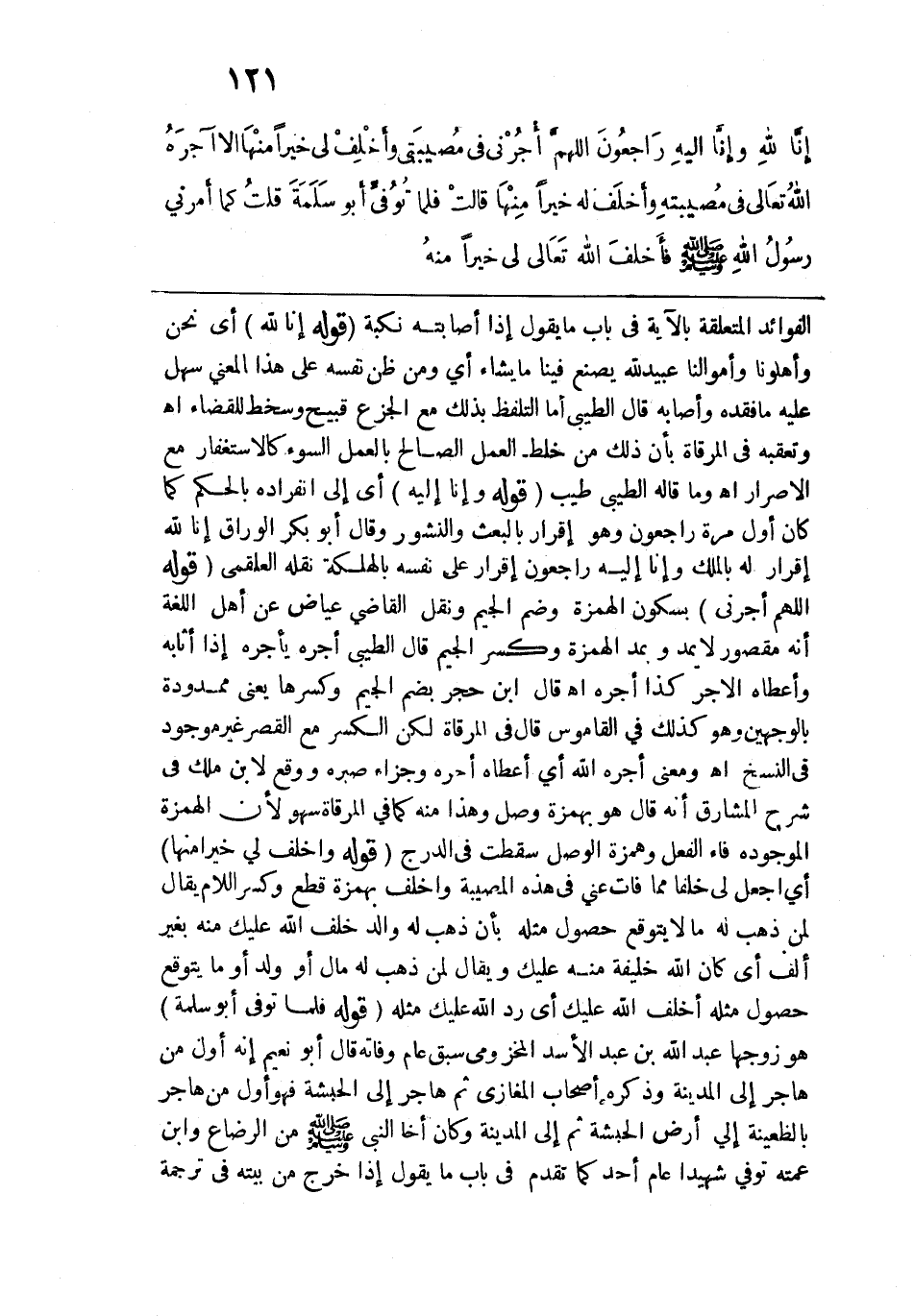 الفوائد المتعلقة بالآية في باب ما يقول إذا أصابته نكبة. قوله: (إنَّا لله) أي نحن وأهلونا وأموالنا عبيد لله يصنع فينا ما يشاء أي ومن ظن نفسه على هذا المعنى سهل عليه ما فقده وأصابه قال الطيبي أما التلفظ بذلك مع الجزع قبيح وسخط للقضاء اهـ، وتعقبه في المرقاة بأن ذلك من خلط العمل الصالح بالعمل السوء كالاستغفار مع الإصرار اهـ، وما قاله الطيبي طيب. قوله: (وإِنَّا إِليهِ) أي إلى انفراده بالحكم كما كان أول مرة راجعون وهو إقرار بالبعث والنشور وقال أبو بكرٍ الوراق إنَّا لله إقرار له بالملك وإنّا إليه راجعون إقرار على نفسه بالهلكة نقله العلقمي. قوله: (اللَّهمَّ أجُرْني) بسكون الهمزة وضم الجيم ونقل القاضي عياض عن أهل اللغة إنه مقصور لا يمد وبمد الهمزة وكسر الجيم قال الطيبي أجره يأجره إذا أثابه وأعطاه الأجر كآجره اهـ. قال ابن حجر بضم الجيم وكسرها يعني مقصورة بالوجهين وهو كذلك في القاموس قال في المرقاة لكن الكسر مع القصر غير موجود في النسخ اهـ، ومعنى أجره الله أي أعطاه أجره وجزاء صبره ووقع لابن ملك في شرح المشارق إنه قال هو بهمزة وصل وهذا منه كما في المرقاة سهو لأن الهمزة الموجودة فاء الفعل وهمزة الوصل سقطت في الدرج. قوله: (وأَخْلِفْ لي خيرًا منْهَا) أي اجعل لي خلفًا مما فات عني في هذه المصيبة وأخلف بهمزة قطع وكسر اللام يقال لمن ذهب له ما لا يتوقع حصول مثله بأن ذهب له والد خلف الله عليك منه بغير ألف أي كان الله خليفة منه عليك ويقال لمن ذهب له مال أو ولد أو ما يتوقع حصول مثله أخلف الله عليك أي رد الله عليك مثله. قوله: (فلمَا تُوُفِّي أَبو سَلَمَةَ) هو زوجها عبد الله بن عبد الأسد المخزومي سبق عام وفاته قال أبو نعيم إنه أول من هاجر إلى المدينة وذكره أصحاب المغازي ثم هاجر إلى الحبشة فهو أول من هاجر بالظعينة إلى أرض الحبشة ثم إلى المدينة وكان أخا النبي - صلى الله عليه وسلم - من الرضاع وابن عمته توفي شهيدًا عام أحد كما تقدم في باب ما يقول إذا خرج من بيته في ترجمة