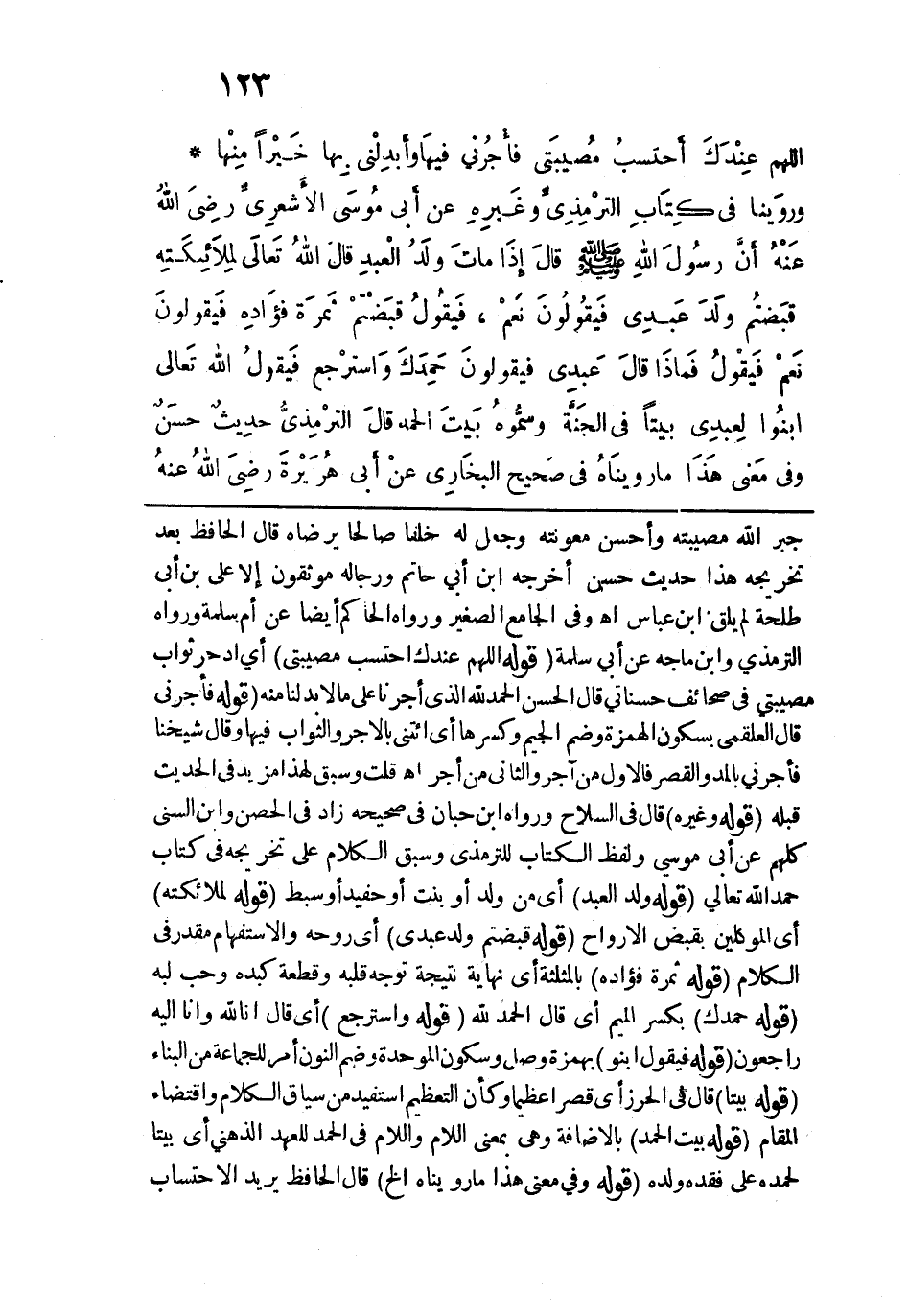 جبر الله مصيبته وأحسن معونته وجعل له خلفًا صالحًا يرضاه قال الحافظ بعد تخريجه هذا حديث حسن أخرجه ابن أبي حاتم ورجاله موثقون إلّا علي بن أبي طلحة لم يلق ابن عباس اهـ، وفي الجامع الصغير ورواه الحاكم أيضًا عن أم سلمة ورواه الترمذي وابن ماجة عن أبي سلمة. قوله: (اللَّهمَّ عِنْدَكَ أَحتَسبُ مُصيبَتي) أي أدخر ثواب مصيبتي في صحائف حسناتي قال الحسن الحمد لله الذي أجرنا على ما لا بد لنا منه. قوله: (فأْجُرني) قال العلقمي بسكون الهمزة وضم الجيم وكسرها أي ائتني بالأجر والثواب فيها وقال شيخنا فأجرني بالمد والقصر فالأول من آجر والثاني من أجر اهـ. قلت وسبق لهذا مزيد في الحديث قبله. قوله: (وغَيرِهِ) قال في السلاح ورواه ابن حبان في صحيحه زاد في الحصين وابن السني كلهم عن أبي موسى ولفظ الكتاب للترمذي وسبق الكلام على تخريجه في كتاب حمد الله تعالى. قوله: (ولَدُ العبدِ) أي من ولد أو بنت أو حفيد أو سبط. قوله: (لِملائِكَتِهِ) أي الموكلين بقبض الأرواح. قولط: (قَبَضتُم ولَدَ عَبدِي) أي زوجه والاستفهام مقدر في الكلام. قوله: (ثَمَرَة فؤَادِه) بالمثلثة أي نهاية نتيجة توجه قلبه وقطعة كبده وحب لبه. قوله: (حَمِدَكَ) بكسر الميم أي قال الحمد لله. قوله: (وَاسترْجع) أي قال: {إِنَّا لِلَّهِ وَإِنَّا إِلَيْهِ رَاجِعُونَ} [البقرة: 156] قوله: (فَيقولُ ابنُوا) بهمزة وصل وسكون الموحدة وضم النون أمر للجماعة من البناء. قوله: (بيتًا) قال في الحرز أي قصرًا عظيمًا وكأن التعظيم استفيد من سياق الكلام واقتضاء المقام. قوله: (بَيتَ الحمد) بالإضافة وهي بمعنى اللام واللام في الحمد للعهد الذهني أي بيتًا لحمده على فقده ولده.