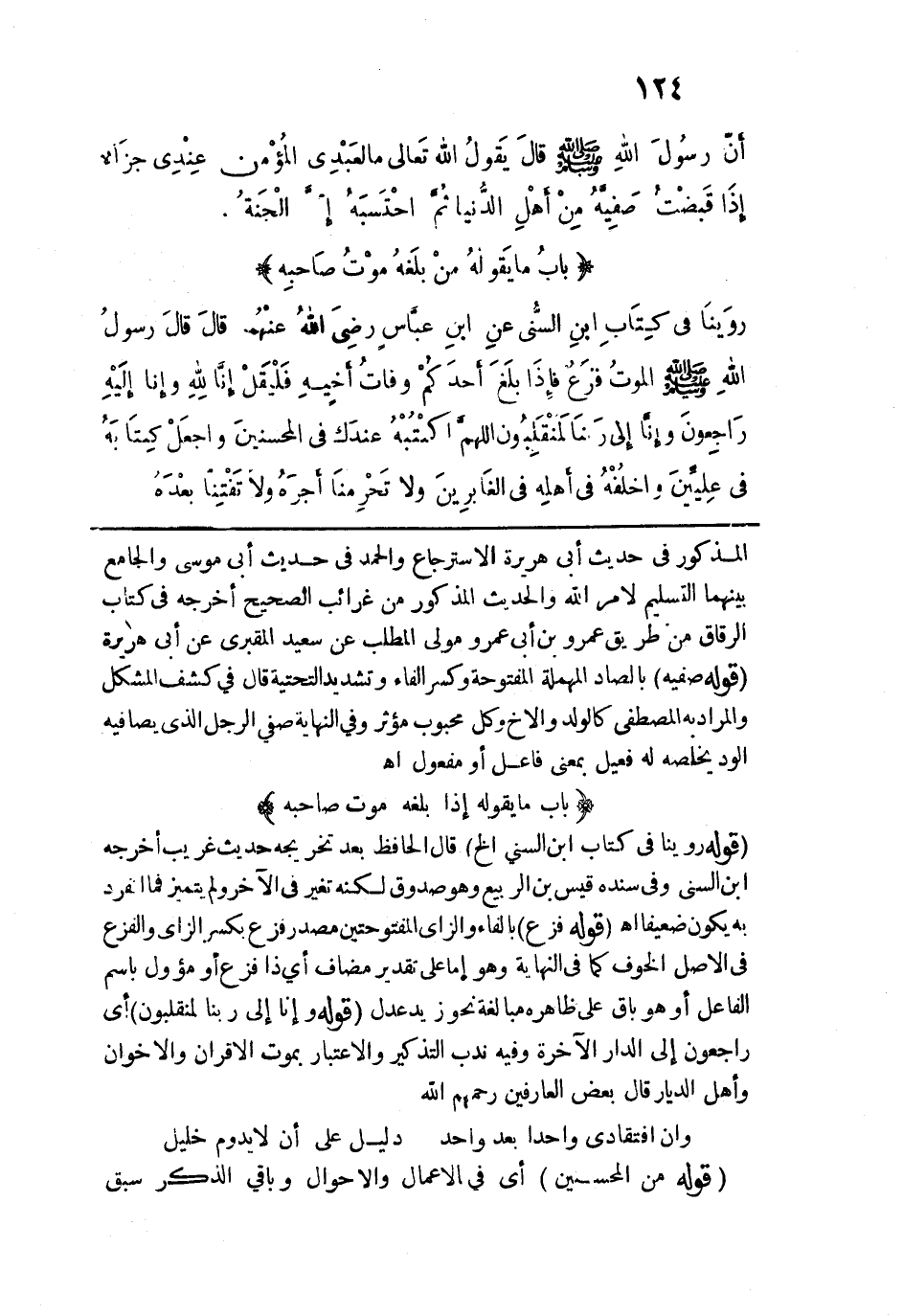 روينا في كتاب ابن السني، عن ابن عباس رضي الله عنهما، قال: قال رسول الله - صلى الله عليه وسلم -: "المَوْتُ فَزَغٌ، فإذا بَلَغَ أحَدَكُمْ وَفَاةُ أخِيهِ فَلْيَقُلْ: إنَّا لِلهِ وَإنَّا إلَيْهِ رَاجِعُونَ، وإنَّا إلى رَبنا لَمُنْقَلِبُونَ، اللهُم اكْتُبْهُ عِنْدَكَ فِي المُحْسِنِينَ، وَاجْعَلْ كِتَابَهُ في علِّيِّينَ، وَاخْلُفْهُ فِي أهْلِهِ في الْغَابِرِينَ، وَلَا تَحْرِمْنا أجْرَهُ ولا تَفْتِنَّا بَعْدَهُ".
