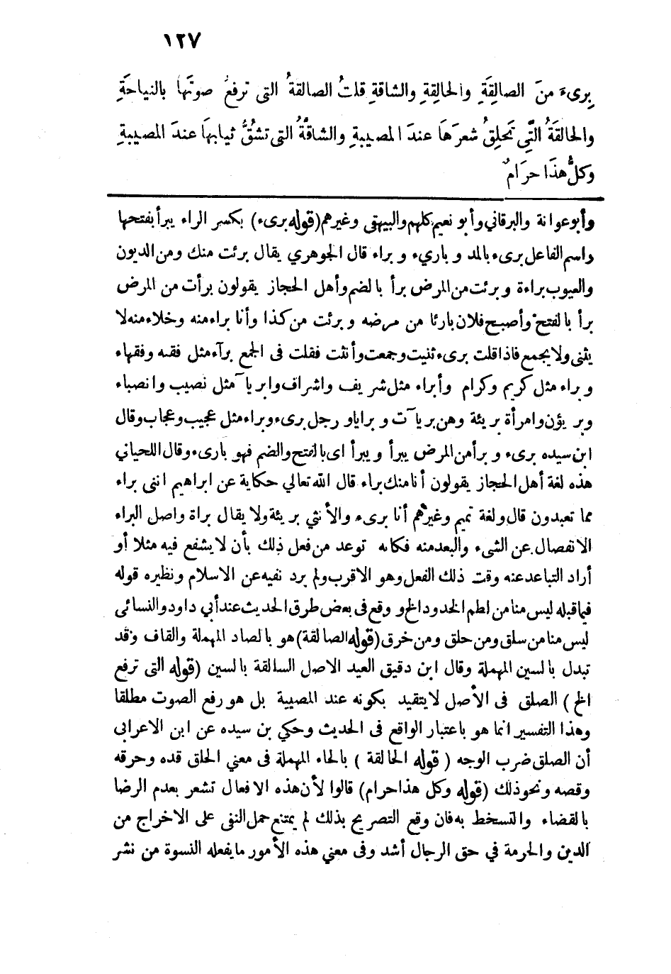 وأبو عوانة والبرقاني وأبو نعيم كلهم والبيهقي وغيرهم. قوله: (بِريءَ) بكسر الراء يبرأ بفتحها واسم الفاعل برئ بالمد وبارئ وبراء قال الجوهري يقال برئت منك ومن الديون والعيوب براءة وبرئت من المرض برأ بالضم وأهل الحجاز يقولون برأت من المرض برأ بالفتح وأصبح فلان بارئًا من مرضه وبرئت من كذا وأنا براء منه وخلاء منه لا يثنى ولا يجمع فإذا قلت بريء ثنيت وجمعت وأنثت فقلت في الجمع برآء مثل فقيه وفقهاء وبراء مثل كريم وكرام وأبراء مثل شريف وأشراف وأبريآ مثل نصيب وأنصباء وبريؤون وامرأة بريئة وهن بريآت وبرايا ورجل بريء وبراء مثل عجيب وعجاب وقال ابن سيدة برئ وبرأ من المرض يبرأ ويبرأ أي بالفتح والضم فهو بارئ وقال اللحياني هذه لغة أهل الحجاز يقولون أنا منك براء قال الله تعالى حكاية عن إبراهيم {إِنَّنِي بَرَاءٌ مِمَّا تَعْبُدُونَ} [الزخرف: 26] قال ولغة تيم وغيرهم أنا بريء والأنثى بريئة ولا يقال براة وأصل البراء الانفصال عن الشيء والبعد منه فكأنه توعد من فعل ذلك بأن لا يشفع فيه مثلًا أو أراد التباعد عنه وقت ذلك الفعل وهو الأقرب ولم يرد نفيه عن الإسلام ونظيره قوله فيما قبله ليس منا من لطم الخدود الخ، ووقع في بعض طرق الحديث عند أبي داود والنسائي ليس منا من سلق ومن حلق ومن خرق. قوله: (الصالقةُ) هو بالصاد المهملة والقاف وقد تبدل بالسين المهملة وقال ابن دقيق العيد الأصل السالقة بالسين. قوله: (التّي ترفعُ الخ) الصلق في الأصل لا يتقيد بكونه عند المصيبة بل هو رفع الصوت مطلقًا وهذا التفسير إنما هو باعتبار الواقع في الحديث وحكى ابن سيدة عن ابن الأعرابي أن الصلق ضرب الوجه. قوله: (الحالقَةُ) بالحاء المهملة في معنى الحلق قده وحرقه وقصه ونحو ذلك. قوله: (وكلُّ هَذَا حَرَامٌ) قالوا لأن هذه الأفعال تشعر بعدم الرضا بالقضاء والتسخط به فإن وقع التصريح بذلك لم يمتنع حمل النفي على الإخراج من الدين والحرمة في حق الرجال أشد وفي معنى هذه الأمور ما يفعله النسوة من نشر