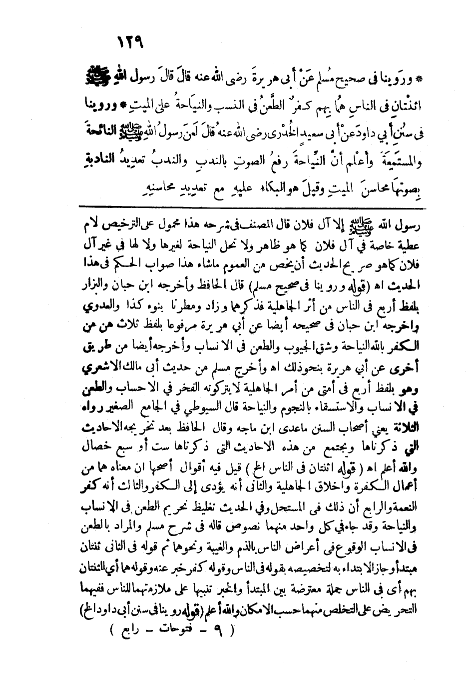 وروينا في "صحيح مسلم" عن أبي هريرة رضي الله عنه قال: قال رسول الله - صلى الله عليه وسلم -: "اثْنَتانِ في النَّاسِ، هُما بِهِمْ كُفْرٌ: الطعْنُ في النَّسَبِ، والنِّيَاحَةُ على المَيِّتِ".