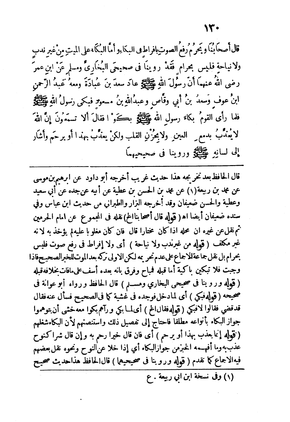 قوله: (وَروَينَا في صحيحَيِّ البُخَارِيِّ ومسلم) قال الحافظ ورواه أبو عوانة في صحيحه. قوله: (فبكى) أي لما دخل فوجده في غشية كما في الصحيح فسأل عنه فقال قد قضى فقالوا لا فبكى. قوله: (فَقَال الخ) أي لما بكي ورآهم بكوا معه خشى أن يتوهموا جواز البكاء بأنواعه مطلقًا فاحتاج إلى تفصيل ذلك واستنصتهم لأن البكاء شغلهم. قوله: (إِنما يعذِّبُ بهذا أَو يرحَم) أي فإن قال خيرًا رحم به وإن قال شرًّا كنوح عذب به وما أفهمه الخبر من جواز البكاء أي إذا خلا عن النوح ونحوه نقل بعضهم فيه الإجماع كما تقدم.