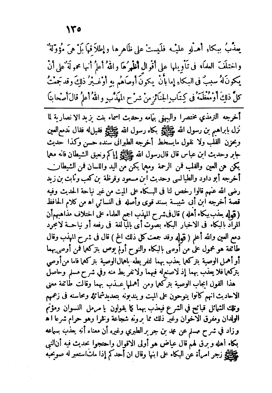 أخرجه الترمذي مختصرًا والبيهقي بتمامه وحديث أسماء بنت يزيد الأنصارية لما نزل بإبراهيم ابن رسول الله - صلى الله عليه وسلم - بكاه رسول الله - صلى الله عليه وسلم - فقيل له فقال تدمع العين ويحزن القلب ولا نقول ما يسخط أخرجه الطبراني سنده حسن وكذا حديث جابر وحديث ابن عباس قال قال رسول الله - صلى الله عليه وسلم - إياكم ونعيق الشيطان فإنه مهما يكن من العين والقلب فمن الرحمة ومهما يكن من اليد واللسان فمن الشيطان أخرجه أبو داود والطيالسي وحديث ابن مسعود وقرظة بن كعب وثابت بن زيد رضي الله عنهم قالوا رخص لنا في البكاء على الميت من غير نياحة الحديث وفيه قصة أخرجه ابن أبي شيبة بسند قوي وأصله في النسائي اهـ. من كلام الحافظ. قوله: (يعذبُ ببكاءِ أهْلِه) قال في شرح المهذب أجمع العلماء على اختلاف مذاهبهم إن المراد بالبكاء في الأخبار البكاء بصوت أي بالمبالغة في رفعه أو نياحة لا مجرد دمع العين والله أعلم. قوله: