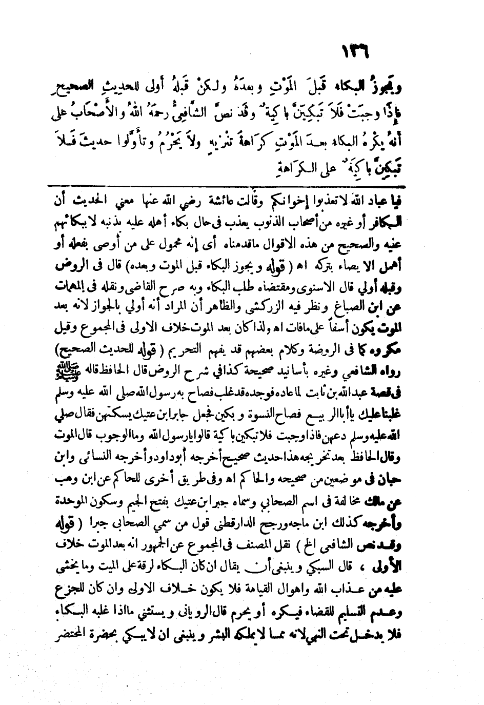 فيا عباد الله لا تعذبوا إخوانكم وقالت عائشة رضي الله عنها معنى الحديث إن الكافر أو غيره من أصحاب الذنوب يعذب في حال بكاء أهله عليه بذنبه لا ببكائهم عليه والصحيح من هذه الأقوال ما قدمناه أي إنه محمول على من أوصى بفعله أو أهمل الإيصاء بتركه اهـ. قوله: (ويَجوزُ البكاءُ قَبلَ المَوْتِ وبعدَهُ) قال في الروض وقبله أولى قال الإسنوي ومقتضاه طلب البكاء وبه صرح القاضي ونقله في المهمات عن ابن الصباغ ونظر فيه الزركشي والظاهر إن المراد إنه أولى بالجواز لأنه بعد الموت يكون أسفًا على ما فات اهـ، ولذا كان بعد الموت خلاف الأولى المجموع وقيل مكروه كما في الروضة وكلام بعضهم قد يفهم التحريم.