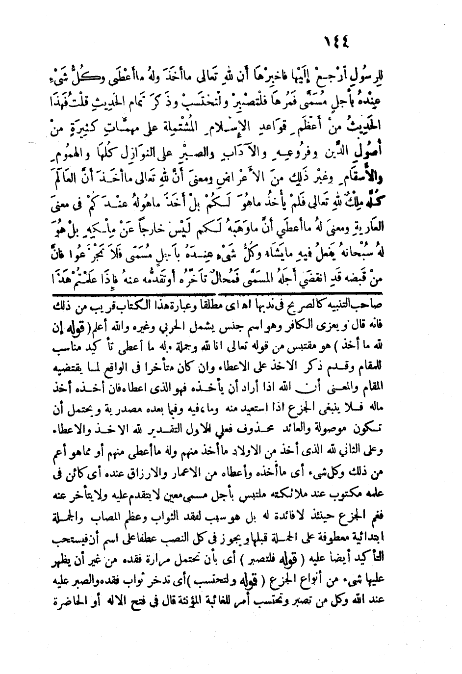 قلت: فهذا الحديث من أعظم قواعد الإسلام، المشتملة على مهمات كثيرة من أصول الدين وفروعه والآداب والصبر على النوازل كلِّها، والهموم والأسقام وغير ذلك من الأعراض، ومعنى: "إن لله تعالى ما أخذ"، أن العالم كلَّه ملْكٌ لله تعالى، فلم يأخذ ما هو لكم، بل أخذ ما هو له عندكم في معنى العارية، ومعنى: "وله ما أعطى" أن ما وهبه لكم ليس خارجًا عن مِلْكه، بل هو له سبحانه يفعل فيه ما يشاء، "وكل شيء عنده بأجل مسمى" فلا تجزعوا، فإن من قبضه قد انقضى أجله المسمَّى فمحال تأخُّره أو تقدُّمه عنه، فإذا علمتم هذا