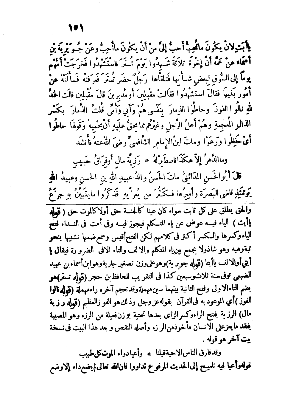 النداء فتح الياء وكسرها والكسر أكثر في كلامهم لكن الفتح أقيس وسمع ضمها تشبيهًا بنحو ثبة وهبه وهو شاذ ولا يجمع بين ياء المتكلم والألف والتاء إلَّا في الضرورة فيقال يا أبتي أو الألف يا أبتا. قوله: (جُوَيْرِيَة) وهو على وزن تصغير جارية وهو ابن أسماء بن عبيد الضبعي توفي سنة ثلاث وسبعين كذا في التقريب للحافظ ابن حجر. قوله: (تُستَرَ) هو بضم التاء الأولى وفتح الثانية بينهما سين مهملة وقد تعجم آخره راء مهملة. قوله: (نالُوا الفوزَ) أي الموعود به في القرآن بقوله عزّ وجل {وَذَلِكَ الْفَوْزُ الْعَظِيمُ} [النساء: 13].قوله: (رَزِيَّة مالٍ) الرزية بفتح الراء كسر الزاي بعدها تحتية بوزن فعيلة من الرزء وهو المصيبة بفقد ما يعز على الإنسان مأخوذ من الرزء وأصله النقص وبعد هذا البيت في نسخة بيت آخر هو قوله: