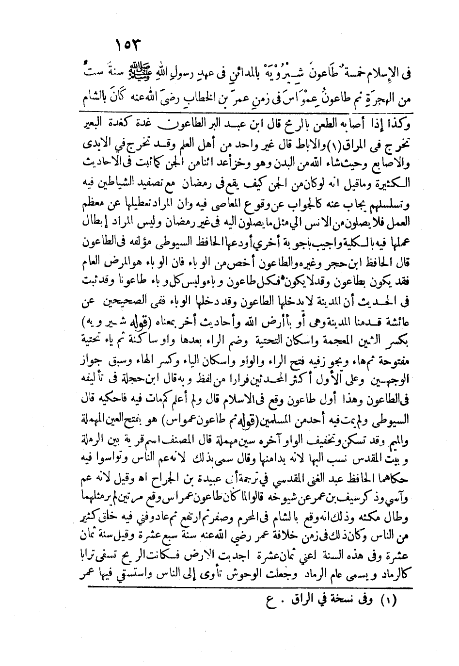 قالوا لما كان طاعون عمواس وقع مرتين لم ير مثلهما وطال مكثه وذلك إنه وقع بالشام في المحرم وصفر ثم ارتفع ثم عاد وفني فيه خلق كثير من النّاس وكان ذلك في زمن خلافة عمر رضي الله عنه سنة سبع عشراة وقيل سنة ثمان عشرة وفي هذه السنة أعني ثمان عشرة أجدبت الأرض فكانت الريح تسفي ترابًا كالرماد ويسمى عام الرماد وجعلت الوحوش تأوي إلى النّاس واستسقى فيها عمر