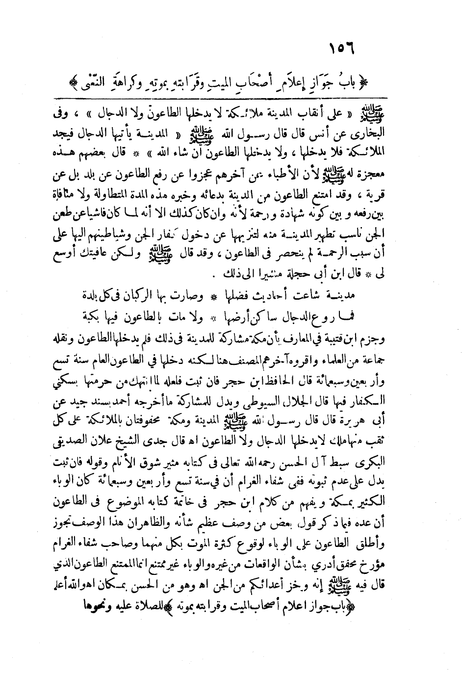 وجزم ابن قتيبة في المعارف بأن مكة مشاركة للمدينة في ذلك فلم يدخلها الطاعون ونقله جماعة من العلماء وأقروه آخرهم المصنف هنا لكنه دخلها في الطاعون العام سنة تسع وأربعين وسبعمائة قال الحافظ ابن حجر فإن ثبت فلعله لما انتهك من حرمتها بسكنى الكفار فيها قال الجلال السيوطي ويدل للمشاركة ما أخرجه أحمد بسند جيد عن أبي هريرة قال قال رسول الله - صلى الله عليه وسلم - المدينة ومكة محفوفتان بالملائكة على كل ثقب منها ملك لا يدخلها الدجال ولا الطاعون اهـ. قال جدي الشيخ علان الصديقي البكري سبي آل الحسن رحمه الله تعالى في كتابه مثير شوق الأنام وقوله فإن ثبت يدل على عدم ثبوته ففي شفاء الغرام أن في سنة تسع وأربعين وسبعمائة كان الوباء الكثير بمكة ويفهم من كلام ابن حجر في خاتمة كتابه الموضوع في الطاعون أن عده فيما ذكر قول بعض من وصف عظيم شأنه والظاهر إن هذا الوصف تجوز وأطلق الطاعون على الوباء لوقوع كثرة الموت بكل منهما وصاحب شفاء الغرام مؤرخ محقق أدرى بشأن الواقعات من غيره والوباء غير