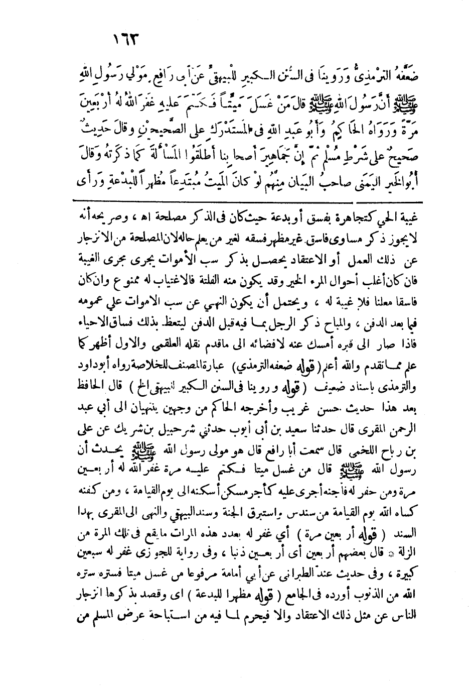 غيبة الحي كتجاهرة بفسق أو بدعة حيث كان في الذكر مصلحة اهـ، وصريحه إنه لا يجوز ذكر مساوي فاسق غير مظهر فسقه لغير من يعلم حاله لأن المصلحة من الانزجار عن ذلك العمل أو الاعتقاد يحصل بذكر سب الأموات يجري مجرى الغيبة فإن كان أغلب أحوال المرء الخير وقد يكون منه الفلتة فالاغتياب له ممنوع وإن كان فاسقًا معلنًا فلا غيبة له، ويحتمل أن يكون النهي عن سب الأموات على عمومه فيما بعد الدفن، والمباح ذكر الرجل بما فيه قبل الدفن ليتعظ بذلك فساق الأحياء فإذا صار إلى قبره أمسك عنه لإفضائه إلى ما قدم نقله العلقمي والأول أظهر كما علم مما تقدم والله أعلم. قوله: (ضَعَّفهُ الترْمذِيُّ) عبارة المصنف للخلاصة رواه أبو داود والترمذي بإسناد ضعيف. قوله: (وَرَوَيْنَا في السُّنن الكبيرِ للْبيهقي الخ) قال الحافظ بعد هذا حديث حسن غريب وأخرجه الحاكم من وجهين ينتهيان إلى أبي عبد الرحمن المقري قال حدثنا سعيد بن أبي أيوب حدثني شرحبيل بن شريك عن علي بن رباح اللخمي قال سمعت أبا رافع قال هو مولى رسول الله - صلى الله عليه وسلم - يحدث أن رسول الله - صلى الله عليه وسلم - قال من غسل ميتا فكتم عليه مرة غفر الله له أربعين مرة ومن حفر له فأجنه أجرى عليه كأجر مسكن أسكنه إلى يوم القيامة، ومن كفنه كساه الله يوم القيامة من سندس وإستبرق الجنة وسند البيهقي والنهي إلى المقرئ بهذا السند. قوله: (أَرْبَعِينَ مَرَّة) أي غفر له بعدد هذه المرات ما يقع في تلك المرة من الزلة.