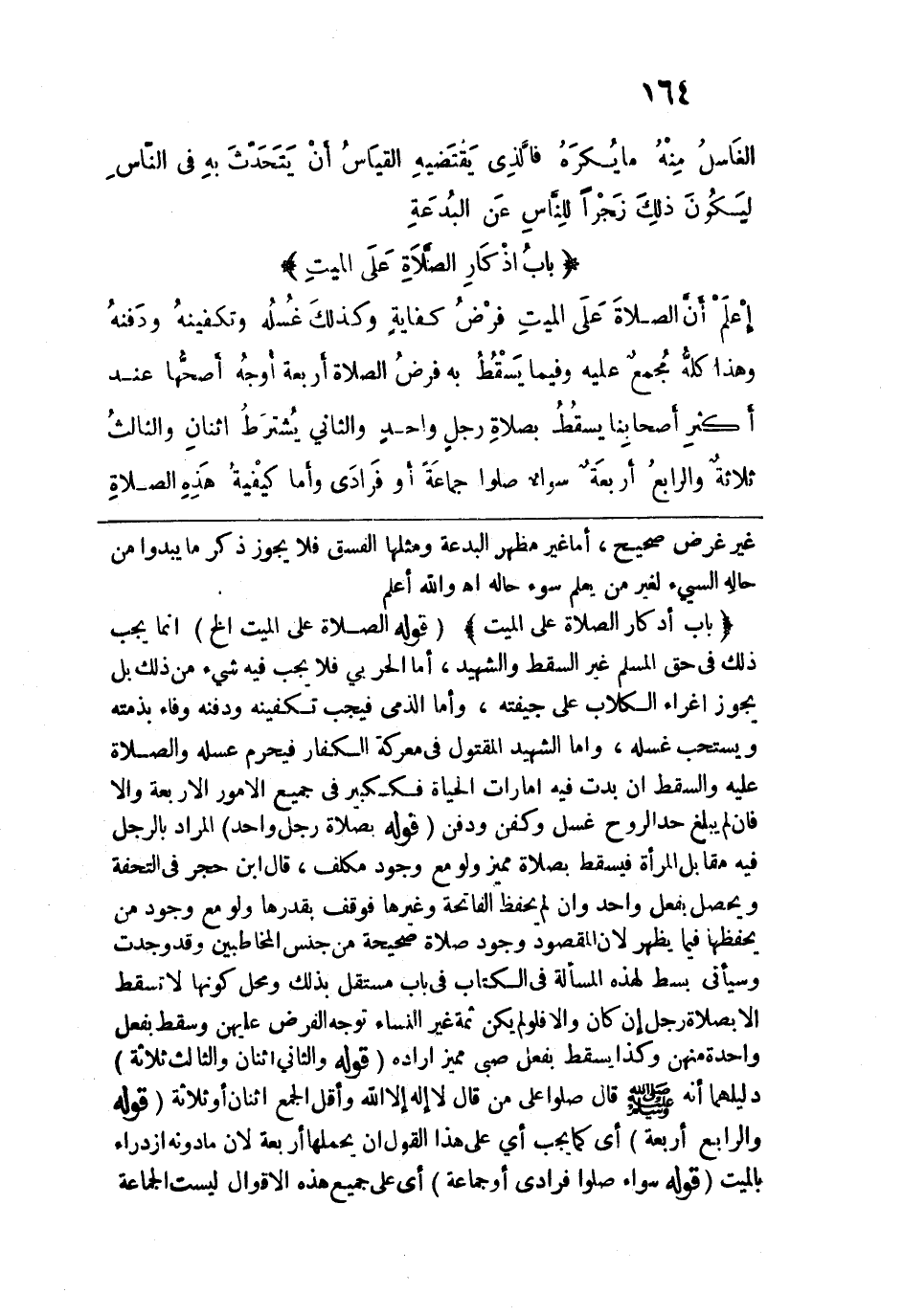 قوله: (الصلاة عَلَى الميتِ الخ) إنما يجب ذلك في حق المسلم غير السقط والشهيد، أما الحربي فلا يجب فيه شيء من ذلك بل يجوز إغراء الكلاب على جيفته، وأما الذمي فيجب تكفينه ودفنه وفاء بذمته ويستحب غسله، وأما الشهيد المقتول في معركة الكفار فيحرم غسله والصلاة عليه والسقط إن بدت فيه أمارات الحياة فكتكبير في جميع الأمور الأربعة وإلا فإن لم يبلغ حد الروح غسل وكفن ودفن. قوله: (بصلاةِ رجلٍ واحد) المراد بالرجل فيه مقابل المرأة فيسقط بصلاة مميز ولو مع وجود مكلف، قال ابن حجر في التحفة ويحصل بفعل واحد وإن لم يحفظ الفاتحة وغيرها فوقف بقدرها ولو مع وجود من يحفظها فيما يظهر لأن المقصود وجود صلاة صحيحة من جنس المخاطبين وقد وجدت وسيأتي بسط لهذه المسألة في الكتاب في باب مستقل بذلك ومحل كونها لا تسقط إلا بصلاة رجل إن كان وإلا فلو لم يكن ثمة غير النساء توجه الفرض عليهن وسقط بفعل واحدة منهن وكذا يسقط بفعل صبي مميز أراده. قوله: (والثاني يُشترَطُ اثنانِ والثالثُ ثلاثة) دليلهما إنه - صلى الله عليه وسلم - قال صلوا على من قال لا إله إلَّا الله وأقل الجمع اثنان أو ثلاثة. قوله: (والرابعُ أَربعَةُ) أي كما يجب أي على هذا القول إن يحملها أربعة لأن ما دونه ازدراء بالميت. قوله: (سواءٌ صلوا فَرادَى أَو جماعَةً) أي على جميع هذه الأقوال ليست الجماعة