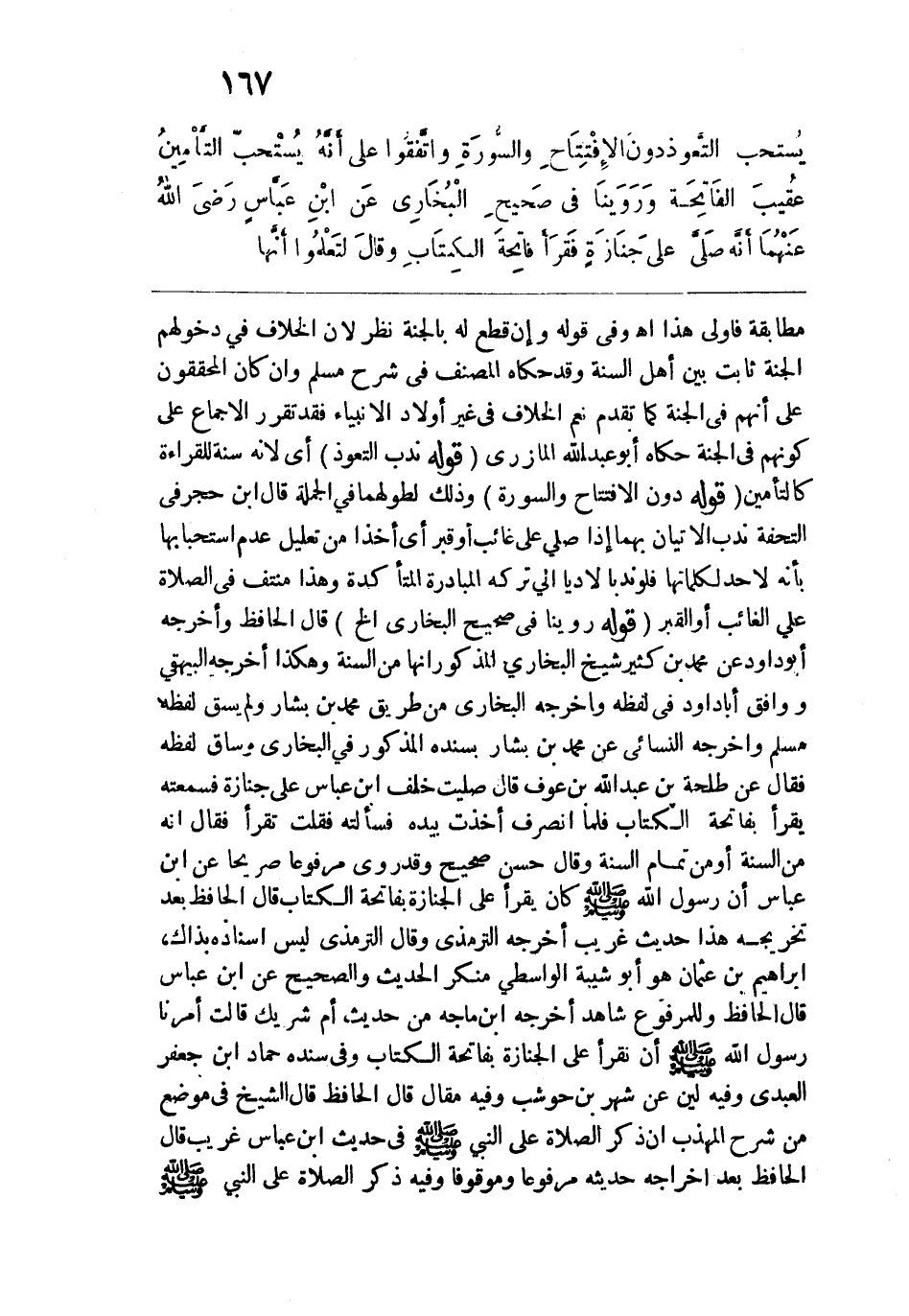 وروينا في "صحيح البخاري" عن ابن عباس رضي الله عنهما، أنه صلى على جنازة، فقرأ فاتحة الكتاب وقال: لتعلموا أنها