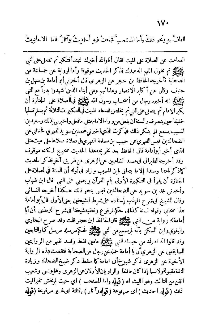 الصامت عن الصلاة على الميت فقال أنا والله أخبرك لتبتدأ فتكبر ثم تصلي على النبي - صلى الله عليه وسلم - ثم تقول اللهم إنه عبدك فذكر الحديث موقوفًا وأما الرواية عن جماعة من الصحابة فأخرجه الحافظ ابن حجر عن الزهري قال أخبرني أبو أمامة بن سهل بن حنيف وكان من أكابر الأنصار وعلمائهم ومن أبناء الذين شهدوا بدرًا مع النبي - صلى الله عليه وسلم - إنه أخبره رجال من أصحاب رسول الله ك - صلى الله عليه وسلم - في الصلاة على الجنازة أن كبر الإمام ثم يصلي على النبي ثم يخلص الدعاء للميت في التكبيرات الثلاثة ثم يسلم تسليمًا خفيفًا حين ينصرف والسنة إن يفعل من وراء الإِمام مثل ما فعل وأخبرني بذلك وسعيد بن المسيب يسمع فلم ينكر ذلك فذكرت الذي أخبرني لمحمد بن سويد الفهري فحدثني عن الضحاك بن قيس الفهري عن حبيب بن مسلمة الفهري في صلاة صلاها على ميت مثل الذي أخبر أبو أمامة قال الحافظ بعد تخريجه هذا الحديث صحيح لكنه موقوف وقد أخرجه الطبراني في مسند الشاميين عن الزهري من طريق آخر فذكر الحديث كما ذكرنا متنا وسندا إلَّا ما يتعلق بابن المسيب وزاد في أوله أن السنة في الصلاة على الجنازة أن يقرأ في التكبيرة الأولى بأم القرآن ويصلى على النبي قال ابن شهاب وأخبرني محمد بن سويد عن الضحاك بن قيس بنحو ذلك هكذا أخرجه النسائي وقال الشيخ في شرح المهذب إسناده على شرط الشيخين يعني الأولى قال أبو أمامة هذا صحابي وقوله السنة كذا في حكم المرفوع وتعقبه شيخنا في شرح الترمذي بأن أبا أمامة له رواية من النبي - صلى الله عليه وسلم - قال الحافظ ابن حجر قلت وقد صرح البخاري والبغوي وابن السكن بأنه لم يسمع من النبي - صلى الله عليه وسلم - فحكم مرسله مرسل كبار التابعين وقد قالوا إنه أدرك من حياة النبي - صلى الله عليه وسلم - عامين فقط وقد ظهر من الروايتين السابقتين عن الزهري أن أبا أمامة حمله عن رجال من الصحابة فنقصت هذه الرواية الأخيرة عن الزهري ذكر شيوخ أبي أمامة كما سقط ذكر شيخ الضحاك وزيادة الثقة مقبولة ولا سيما إذا كان حافظا والراويان الأولان عن الزهري وهما يونس وشعيب أتقن من الثالث وهو الليث اهـ.