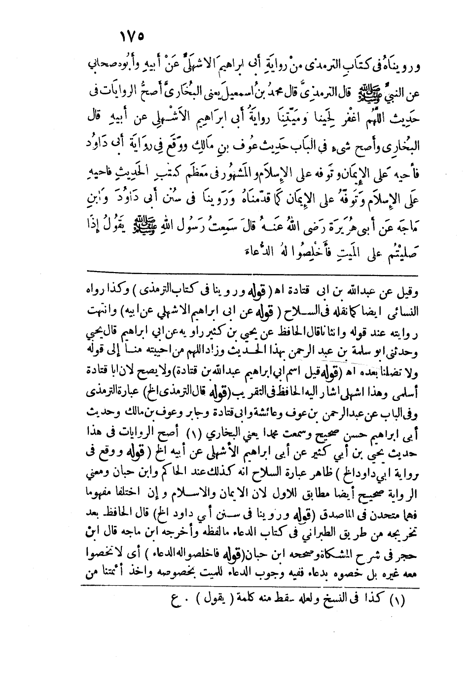 ورويناه في كتاب الترمذي، من رواية أبي إبراهيم الأشهلي عن أبيه، وأبوه صحابي، عن النبي - صلى الله عليه وسلم -، قال الترمذي: قال محمد بن إسماعيل -يعني البخاري- أصحُّ الروايات في حديث: "اللهُمَّ اغْفِرْ لِحَيِّنا وَمَيِّتِنا"، رواية أبي إبراهيم الأشهلي عن أبيه. قال البخاري: وأصحُّ شيء في الباب، حديث عوف بن مالك. ووقع في رواية أبي داود: "فأحْيِهِ على الإيمَانِ، وَتَوَفّهُ على الإسْلامِ". والمشهور في معظم كتب الحديث، "فأحْيِهِ على الإسْلام، وَتَوَفّهُ على الإيمَانِ" كما قدَّمناه.