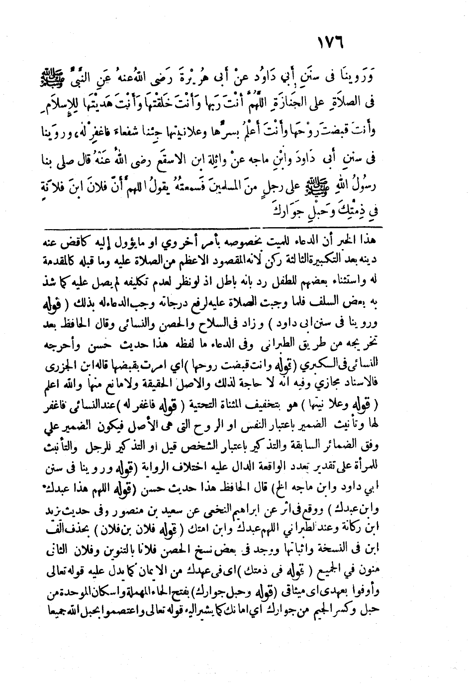 قوله: (وَرَوَيْنَا في سننِ أَبِي دَاوُدَ وابْنِ ماجةَ الخ) قال الحافظ هذا حديث حسن. قوله: (اللَّهُمَّ هَذَا عَبدُك وابْنُ عبْدِكَ) ووقع في أثر عن إبراهيم النخعي عن سعيد بن منصور وفي حديث زيد بن ركانة وعند الطبراني اللهم عبدك وابن امتك. قوله: (فلانَ بن فلانٍ) بحذف ألف ابن في النسخة وإثباتها ووجد في بعض نسخ الحصين فلانًا بالتنوين وفلان الثاني منون في الجميع. قوله: (في ذِمْتِكَ) أي فعهدك من الإيمان كما يدل عليه قوله تعالى: {وَأَوْفُوا بِعَهْدِي} [البقرة: 40] أي ميثاقي. قوله: (وَحَبْلِ جِوارك) بفتح الحاء المهملة وإسكان الموحدة من جبل وكسر الجيم من جوارك أي أمانك كما يشير إليه قوله تعالى: {وَاعْتَصِمُوا بِحَبْلِ اللَّهِ جَمِيعًا} [آل عمران: 103]،