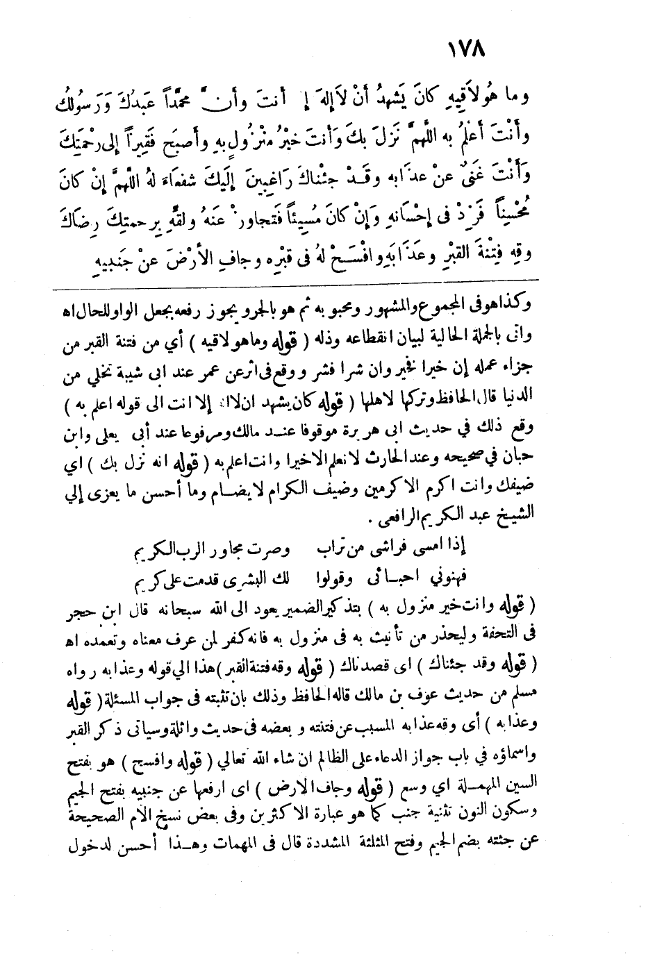 وليحذر من تأنيث به في منزول به فإنه كفر لمن عرف معناه وتعمده اهـ. قوله: (وقَدْ جئْناكَ) أي قصدناك. قوله: (وقِه فِتْنةَ القبْرِ) هذا إلى قوله وعذابه رواه مسلم من حديث عوف بن مالك قاله الحافظ وذلك بأن تثبته في جواب المسألة. قوله: (وعذَابه) أي وقه عذابه المسبب عن فتنته وبعضه في حديث واثلة وسيأتي ذكر القبر وأسماؤه في باب جواز الدعاء على الظالم إن شاء الله تعالى. قوله: (وافْسَحْ) هو بفتح السين المهملة أي وسع. قوله: (وجفِ الأرْضَ) أي ارفعها عن جنبيه بفتح الجيم وسكون النون تثنية جنب كما هو عبارة الأكثرين وفي بعض نسخ الأم الصحيحة عن جثته بضم الجيم وفتح المثلثة المشددة قال في المهمات وهذا أحسن لدخول