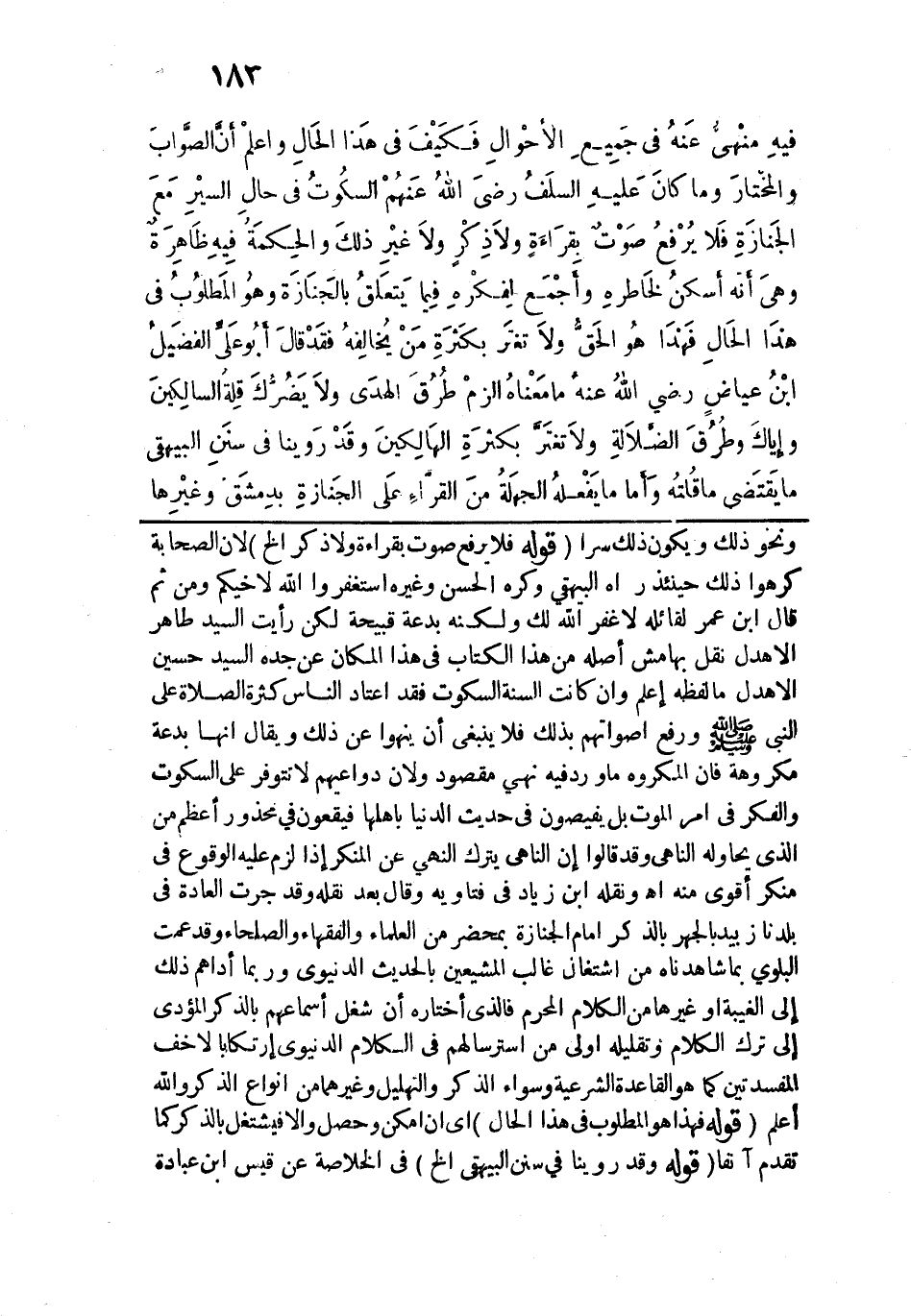 بدعة قبيحة لكن رأيت السيد طاهر الأهدل نقل بهامش أصله من هذا الكتاب في هذا المكان عن جده السيد حسين الأهدل ما لفظه اعلم وإن كانت السنة السكوت فقد اعتاد النّاس كثرة الصلاة على النبي - صلى الله عليه وسلم - ورفع أصواتهم بذلك فلا ينبغي أن ينهوا عن ذلك ويقال أنها بدعة مكروهة فإن المكروه ما ورد فيه نهي مقصود ولأن دواعيهم لا تتوفر على السكوت والفكر في أمر الموت بل يفيضون في حديث الدنيا بأهلها فيقعون في محذور أعظم من الذي يحاوله الناهي وقد قالوا إن الناهي يترك النهي عن المنكر إذا لزم عليه الوقوع في منكر أقوى منه اهـ، ونقله ابن زياد في فتاويه وقال بعد نقله وقد جرت العادة في بلدنا زبيد بالجهر بالذكر أمام الجنازة بمحضر من العلماء والفقهاء والصلحاء وقد عمت البلوى بما شاهدناه من اشتغال غالب المشيعين بالحديث الدنيوي وربما أداهم ذلك إلى الغيبة أو غيرها من الكلام المحرم فالذي اختاره أن شغل أسماعهم بالذكر المؤدي إلى ترك الكلام وتقليله أولى من استرسالهم في الكلام الدنيوي ارتكابًا لأخف المفسدتين كما هو القاعدة الشرعية وسواء الذكر والتهليل وغيرهما من أنواع الذكر والله أعلم. قوله: (فَهذَا هُو المطلُوبُ في هَذَا الحَالِ) أي إن أمكن وحصل وإلا فيشتغل بالذكر كما تقدم آنفًا. قوله: (وقَدْ رَوَيْنَا في سنَنِ البيهقي الخ) في الخلاصة عن قيس بن عبادة
