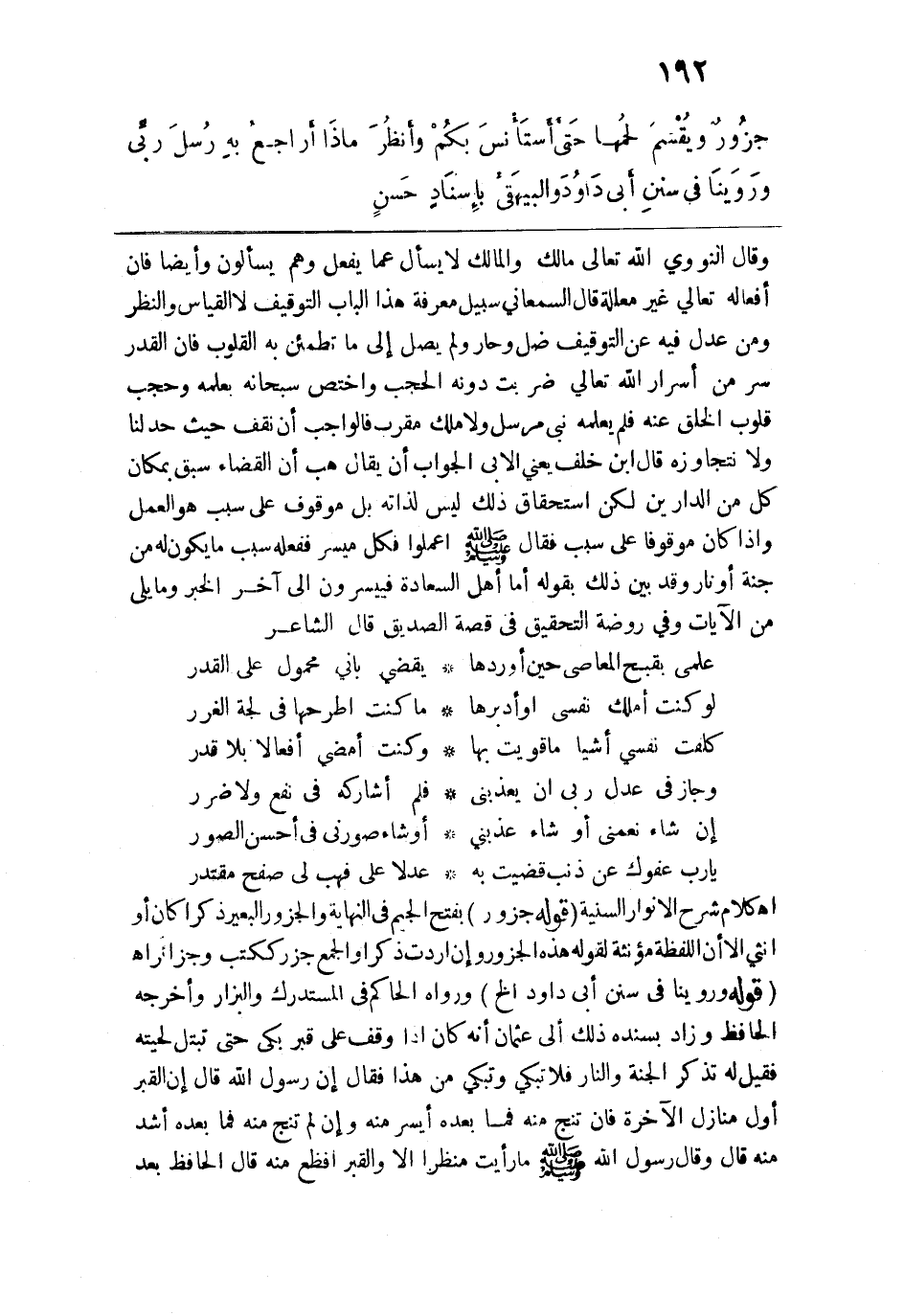 وقال النووي الله تعالى مالك والمالك لا يسأل عما يفعل وهم يسألون وأيضًا فإن أفعاله تعالى غير معللة قال السمعاني سبيل معرفة هذا الباب التوقيف لا القياس والنظر ومن عدل فيه عن التوقيف ضل وحار ولم يصل إلى ما تطمئن به القلوب فإن القدر سر من أسرار الله تعالى ضربت دونه الحجب واختص