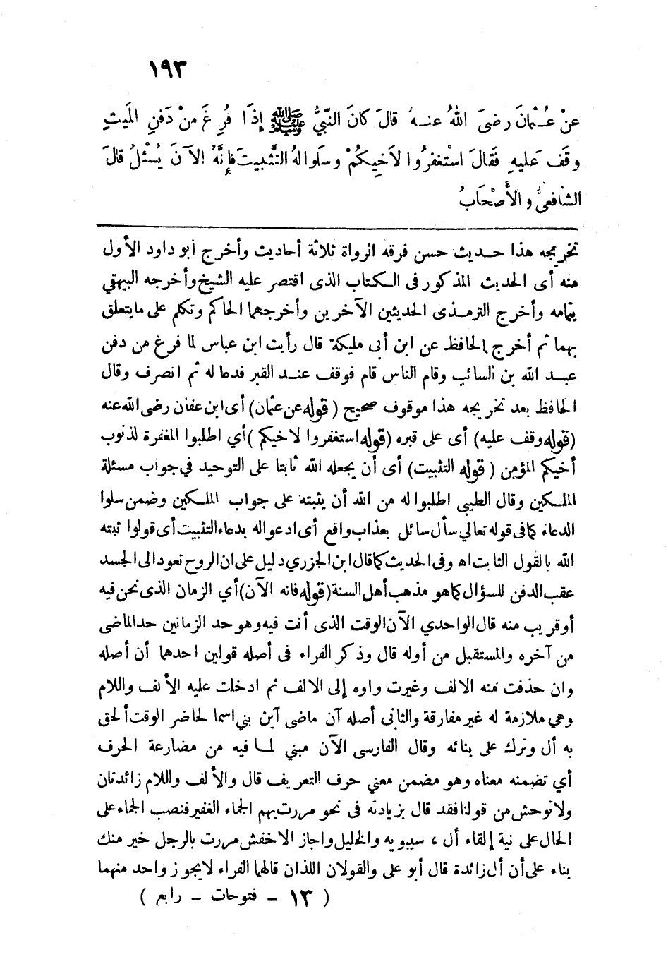 تخريجه هذا حديث حسن فرقه الرواة ثلاثة أحاديث وأخرج أبو داود الأول منه أي الحديث المذكور في الكتاب الذي اقتصر عليه الشيخ وأخرجه البيهقي بتمامه وأخرج الترمذي الحديثين الآخرين وأخرجهما الحاكم وتكلم على ما يتعلق بهما ثم أخرج الحافظ عن ابن أبي مليكة قال رأيت ابن عباس لما فرغ من دفن عبد الله بن السائب وقام النّاس قام فوقف عند القبر فدعا له ثم انصرف وقال الحافظ بعد تخريجه هذا موقوف صحيح. قوله: (عَنْ عُثمَانَ) أي ابن عفان رضي الله عنه. قوله: (وقَف عَليهِ) أي على قبره. قوله: (اسْتغفروا لأَخِيكُمْ) أي اطلبوا المغفرة لذنوب أخيكم المؤمن. قوله: (التَّثبيتَ) أي إن يجعله الله ثابتًا