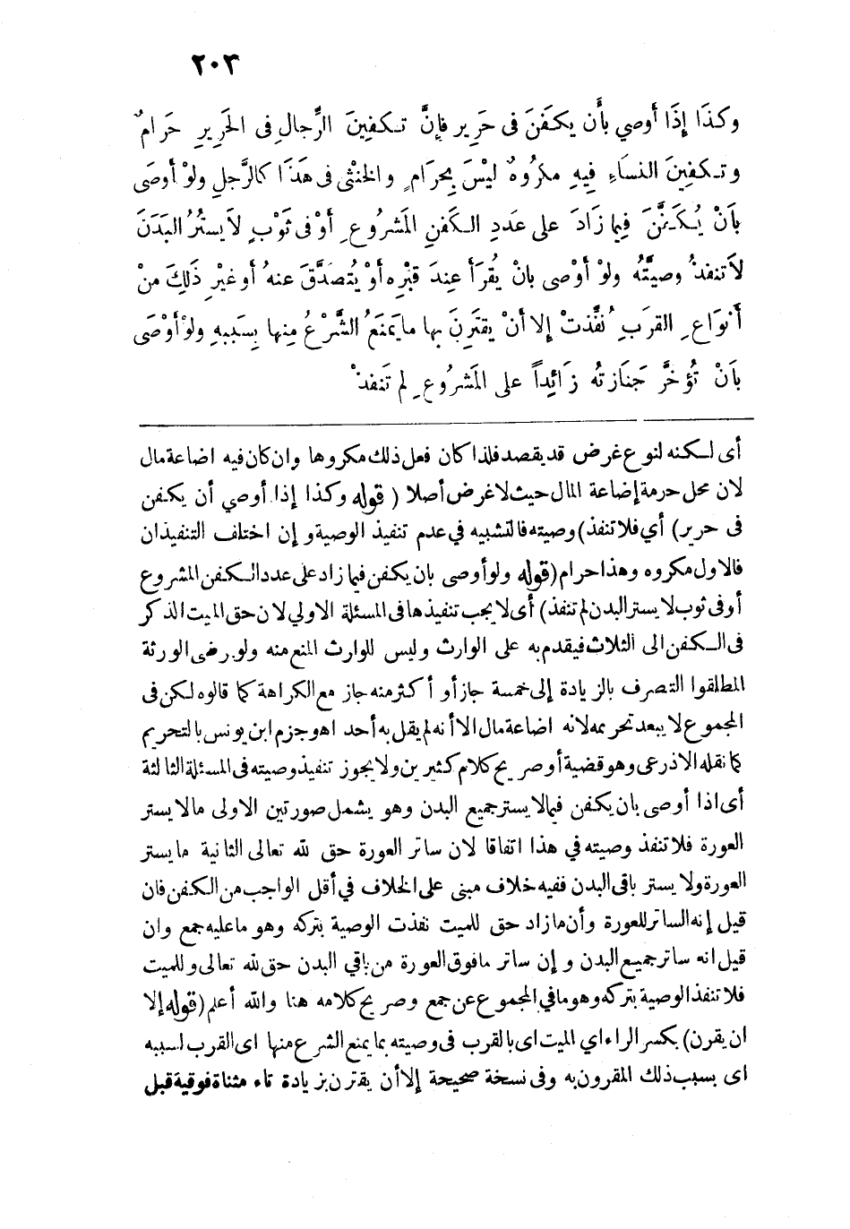 أي لكنه لنوع غرض قد يقصد فلذا كان فعل ذلك مكروهًا وإن كان فيه اضاعة مال لأن محل حرمة إضاعة المال حيث لا غرض أصلًا. قوله: (وكذَا إِذَا أَوصى بان يكَفنَ في حَرِير) أي فلا تنفذ وصيته فالتشبيه في عدم تنفيذ الوصية وإن اختلف التنفيذان فالأول مكروه وهذا حرام. قوله: (ولوْ أَوصَى بأَنْ يُكَفَّنَ فِيا زَادَ عَلَى عَددِ الكَفنِ المَشرُوع أَوْ في ثَوْب لَا يستُرُ البَدَنَ لَمْ تنفذُ) أي لا يجب تنفيذها في المسألة الأولى لأن حق الميت الذكر فَي الكفن إلَى الثلاث فيقدم به على الوارث وليس للوارث المنع منه ولو رضي الورثة المطلقوا التصرف بالزيادة إلى خمسة جاز أو أكثر منه جاز مع الكراهة كما قالوه لكن في المجموع لا يبعد تحريمه لأنه إضاعة مال إلَّا أنه لم يقل به أحد اهـ، وجزم ابن يونس بالتحريم كما نقله الأذرعي وهو قضية أو صريح كلام كثيرين ولا يجوز تنفيذ وصيته في المسألة الثالثة أي إذا أوصى بأن يكفن فيما لا يستر جميع البدن وهو يشمل صورتين الأولى ما لا يستر العورة فلا تنفذ وصيته في هذا اتفاقًا لأن ساتر العورة حق لله تعالى الثانية ما يستر العورة ولا يستر باقي البدن ففيه خلاف مبني على الخلاف في أقل الواجب من الكفن فإن قيل إنه الساتر للعورة وأن ما زاد حق للميت نفذت الوصية بتركه وهو ما عليه جمع وإن قيل إنه ساتر جميع البدن وإن ساتر ما فوف العورة من باقي البدن حق لله تعالى وللميت فلا تنفذ الوصية بتركه وهو ما في المجموع عن جمع وصريح كلامه هنا والله أعلم. قوله: (إلا أَنْ يقرنَ) بكسر الراء أي الميت أي