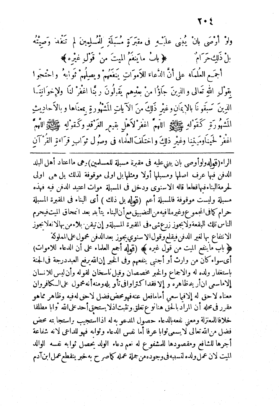 قوله: (أَجمَع العُلمَاءُ عَلَى أَن للأَموَاتِ) أي سواء كان من وارث أو أجنبي ينفعهم وفي الخبر إن الله يرفع العبد درجة في الجنة باستغفار ولده له والإجماع والخبر مخصصات وقيل ناسخان لقوله وأن ليس للإنسان إلَّا ما سعى إن أريد ظاهره وإلأ فقد أكثرا وافي تأويله ومنه أنه محمول على الكافر وإن معناه لا حق له إلا فيما سعي أما ما فعل عنه فهو محض فضل لا حق له فيه وظاهر مما هو مقرر في محله أن المراد بالحق هنا نوع تغلق ونسبة إذ لا يستحق أحد على الله ثوابًا مطلقًا خلافًا للمعتزلة ومعنى نفعه بالدعاء حصول المدعو به له إذا استجيب واستجابته محض فضل من الله تعالى لا يسمى ثوابًا عرفًا أما نفس الدعاء وثوابه فهو للداعي لأنه شفاعة أجرها للشافع ومقصودها للمشفوع له نعم دعاء الولد يحصل ثوابه نفسه للوالد الميت لأن عمل ولده لتسببه في وجوده من جملة عمله كما صرح به خبر ينقطع عمل ابن آدام