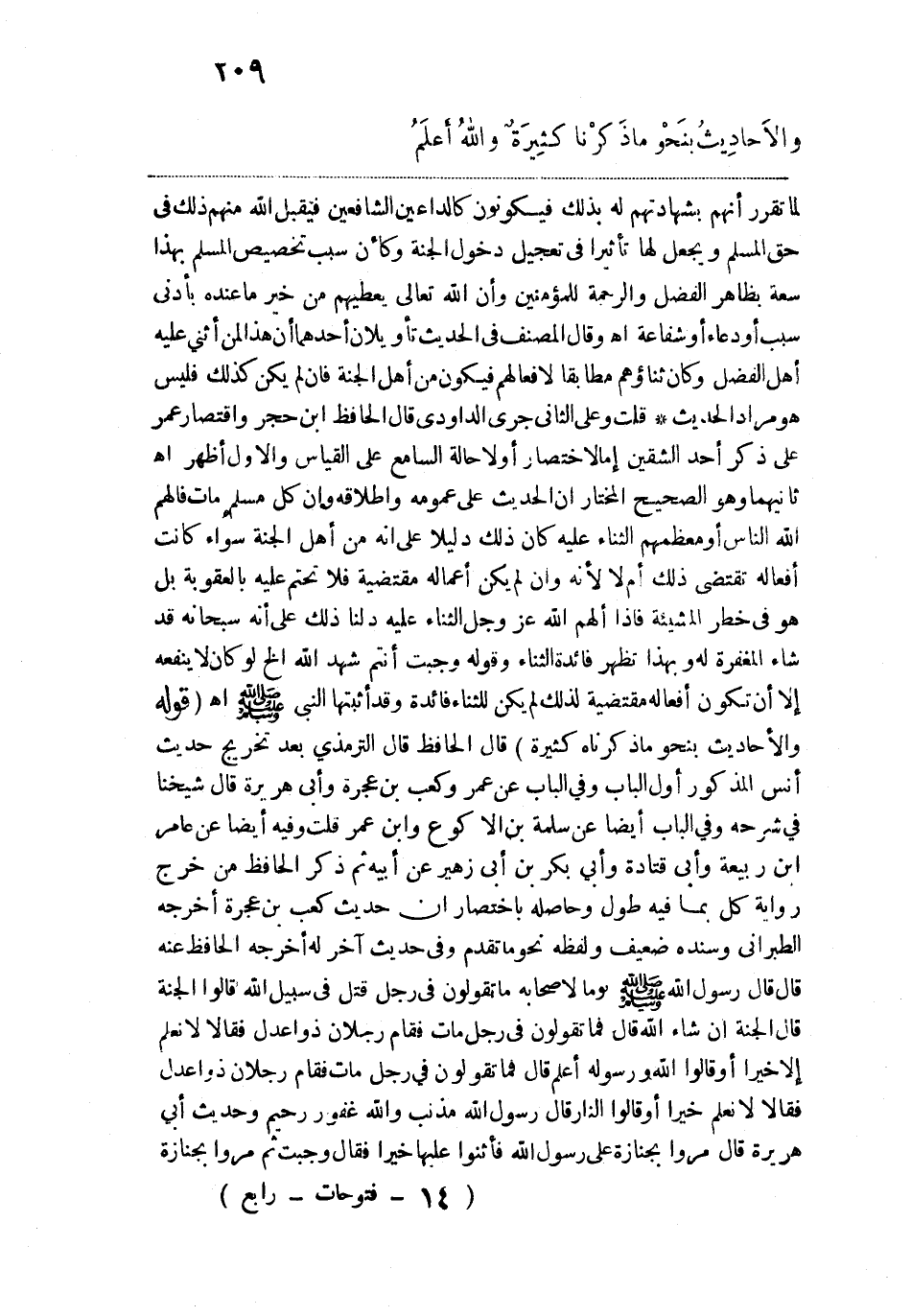 قلت وعلى الثاني جرى الداودي قال الحافظ ابن حجر واقتصار عمر على ذكر أحد الشقين إما الاختصار أو لإحالة السامع على القياس والأول أظهر اهـ. ثانيهما وهو الصحيح المختار إن الحديث على عمومه وإطلاقه وإن كل مسلم مات فألهم الله النّاس أو معظمهم الثناء عليه كان ذلك دليلًا على أنه من أهل الجنة سواء كانت أفعاله تقتضي ذلك أم لا لأنه وإن لم يكن أعماله مقتضية فلا تحتم عليه بالعقوبة بل هو في خطر المشيئة فإذا ألهم الله عزّ وجل الثناء عليه دلنا ذلك على أنه سبحانه قد شاء المغفرة له وبهذا تظهر فائدة الثناء وقوله وجبت أنتم شهد الله الخ. لو كان لا ينفعه إلَّا أن تكون أفعاله مقتضية لذلك لم يكن للثناء فائدة وقد أثبتها النبي - صلى الله عليه وسلم - اهـ. قوله: (والأَحادِيثُ بنَحْو مَا ذَكرْنا كثيرة)