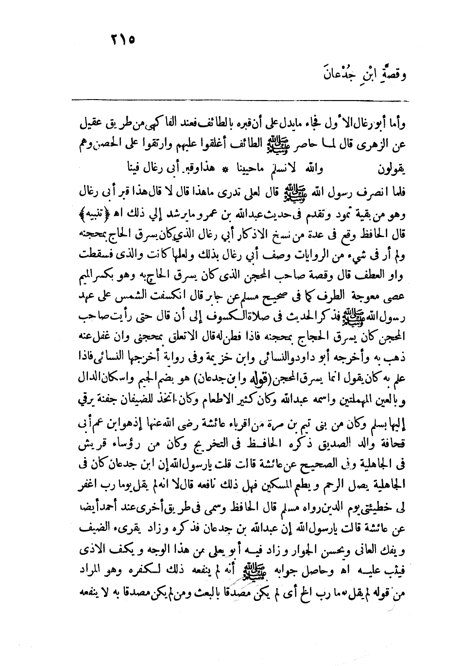 شيء من الروايات وصف أبي رغال بذلك ولعلها كانت والذي فسقطت واو العطف قال وقصة صاحب المحجن الذي كان يسرق الحاج به وهو بكسر الميم عصى معوجة الطرف كما في صحيح مسلم عن جابر قال انكسفت الشمس على عهد رسول الله - صلى الله عليه وسلم - فذكر الحديث في صلاة الكسوف إلى أن قال حتى رأيت صاحب المحجن كان يسرق الحجاج بمحجنه فإذا فطن له قال إلا تعلق بمحجني وإن غفل عنه ذهب به وأخرجه أبو داود والنسائي وابن خزيمة وفي رواية أخرجها النسائي فإذا علم به كان يقول إنما يسرق المحجن قوله: (وابْنِ جدْعانَ) هو بضم الجيم وإسكان الدال وبالعين المهملتين واسمه عبد الله وكان كثير الإطعام وكان اتخذ للضيفان جفنة يرقى إليها بسلم وكان من بني تيم بن مرة من أقرباء عائشة رضي الله عنها إذ هو ابن عم أبي قحافة والد الصديق ذكره الحافظ في التخريج وكان من رؤساء قريش في الجاهلية وفي الصحيح عن عائشة قالت قلت يا رسول الله إن ابن جدعان كان في الجاهلية يصل الرحم ويطعم المسكين فهل ذلك نافعه قال لا إنه لم يقل بها رب اغفر لي خطيئتي يوم الدين رواه مسلم قال الحافظ وسمي في طريق أخرى عند أحمد أيضًا عن عائشة قالت يا رسول الله إن عبيد الله بن جدعان فذكره وزاد يقرئ الضيف ويفك العاني ويحسن الجوار وزاد فيه أبو يعلى من هذا الوجه ويكف الأذى فيثب عليه اهـ، وحاصل جوابه - صلى الله عليه وسلم - أنه لم ينفعه ذلك لكفره وهو المراد من قوله لم يقل يومًا رب الخ. أي لم يكن مصدقًا بالبعث ومن لم يكن مصدقًا به لا ينفعه
