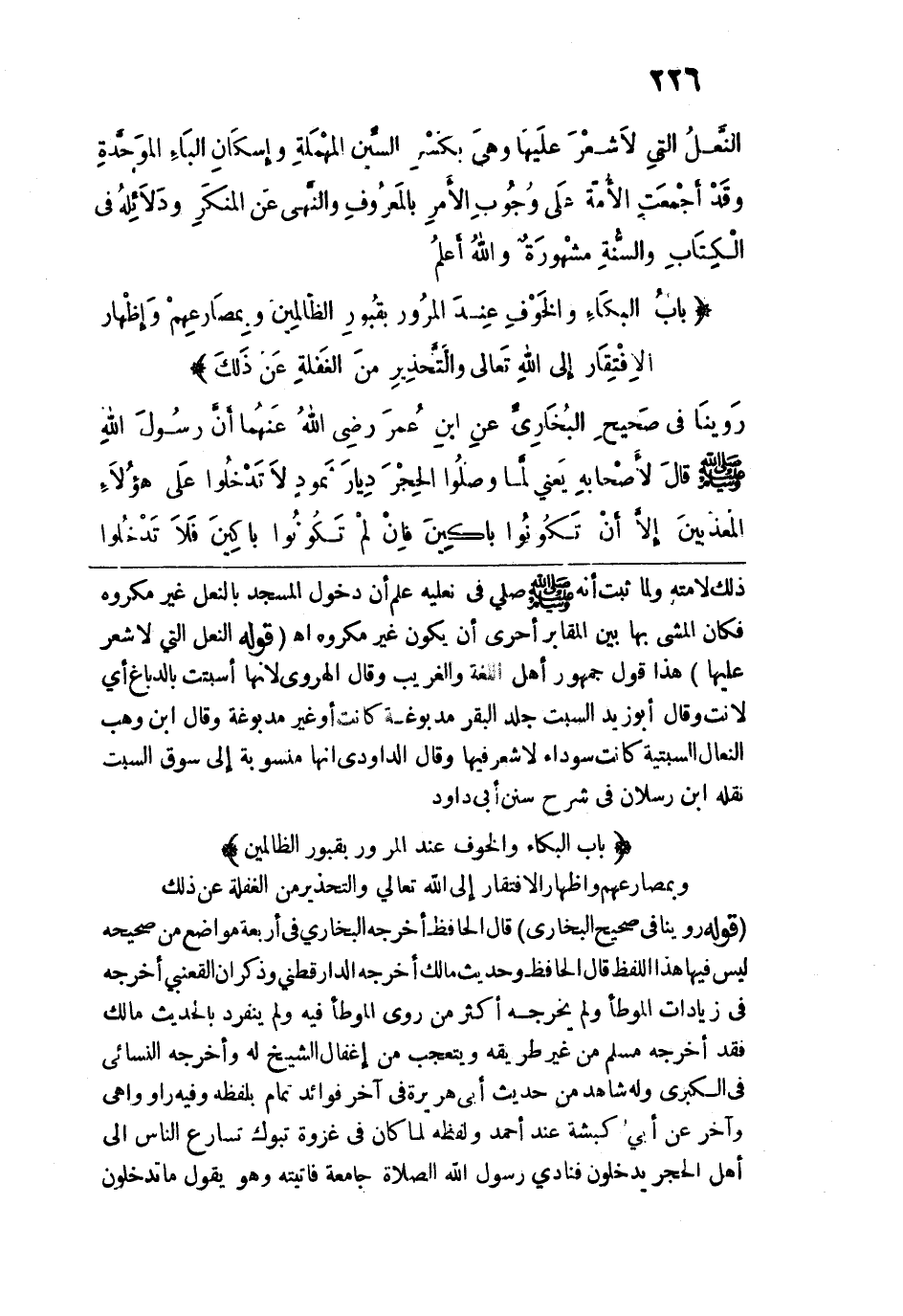 روينا في "صحيح البخاري" عن ابن عمر رضي الله عنهما، أن رسول الله - صلى الله عليه وسلم - قال لأصحابه -يعني لما وصلوا الحِجر ديار ثمود-: "لا تَدْخُلوا على هَؤلاءِ المُعَذَّبِينَ إلَّا أنْ تكُونُوا باكينَ. فإنْ لَمْ تكونوا باكينَ، فَلا تَدْخُلُوا