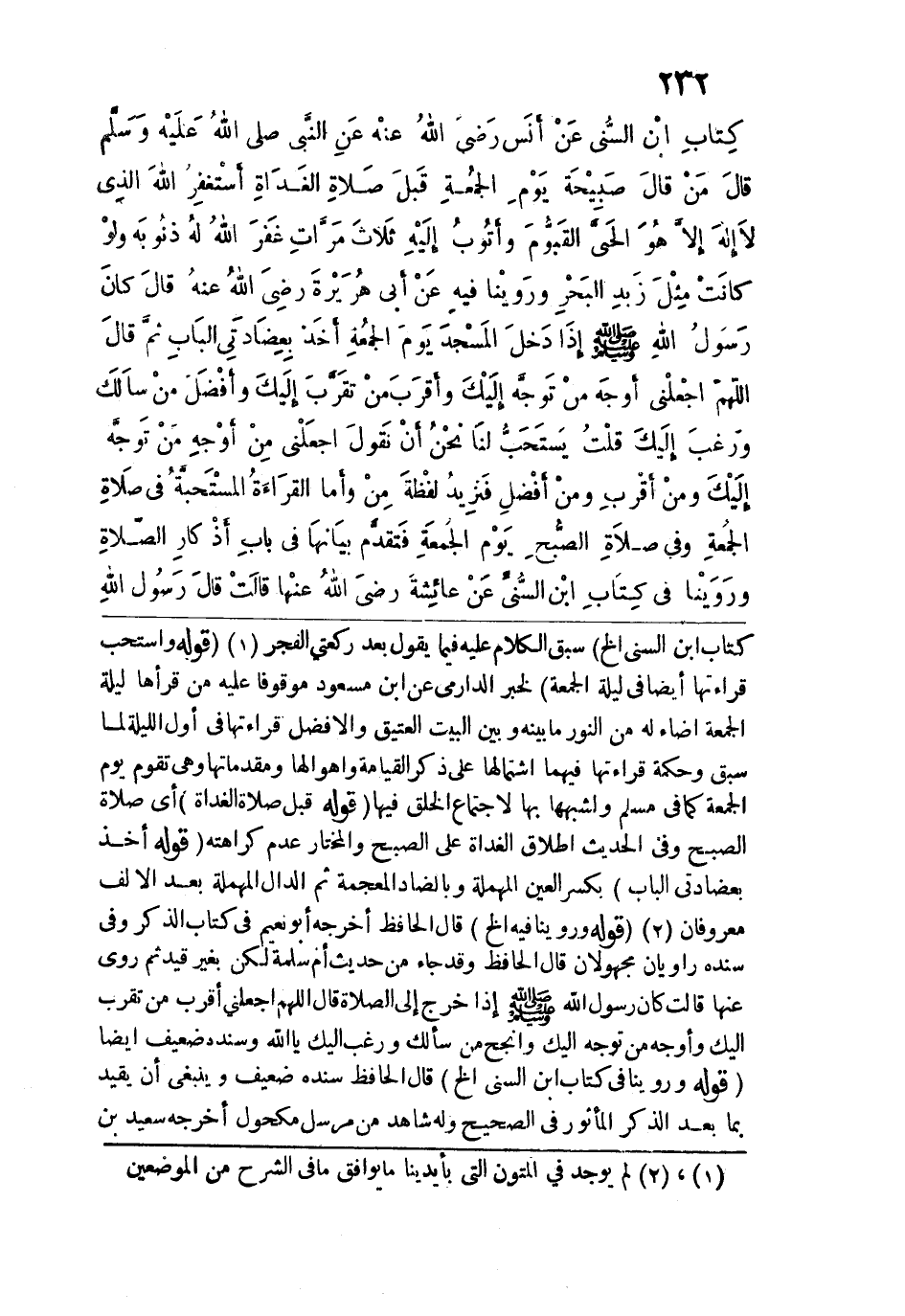 كِتَاب ابْن السني الخ) سبق الكلام عليه فيما يقول بعد ركعتي الفجر. قوله: (وأستحبُّ قرَاءَتَها في ليْلَةِ الجُمعَةِ) لخبر الدارمي عن ابن مسعود موقوفًا عليه من قرأها ليلة الجمعة أضاء له من النور ما بينه وبين البيت العتيق والأفضل قراءتها في أول الليلة لما سبق وحكمة قراءتها فيهما اشتمالها على ذكر القيامة وأهوالها ومقدماتها وهي تقوم يوم الجمعة كما في مسلم ولشبهها بها لاجتماع الخلق فيها. قوله: (قبلَ صلاةِ الغدَاةِ) أي صلاة الصبح وفي الحديث إطلاق الغداة على الصبح والمختار عدم كراهته. قوله: (أَخذ بِعضادَتي البَاب) بكسر العين المهملة وبالضاد المعجمة ثم الدال المهملة بعد الألف معروفان. قوله: (وَرَوَينَا فيهِ الخ) قال الحافظ أخرجه أبو نعيم في كتاب الذكر وفي سنده راويان مجهولان قال الحافظ وقد جاء من حديث أم سلمة لكن بغير قيد ثم روي عنها قالت كان رسول الله - صلى الله عليه وسلم - إذا خرج إلى الصلاة قال اللهم اجعلنى أقرب من تقرب اليك وأوجه من توجه إليك وأنجح من سألك ورغب إليك يا الله وسنده ضعيف أيضًا. قوله: (وَرَوَينَا في كِتَابِ ابْن