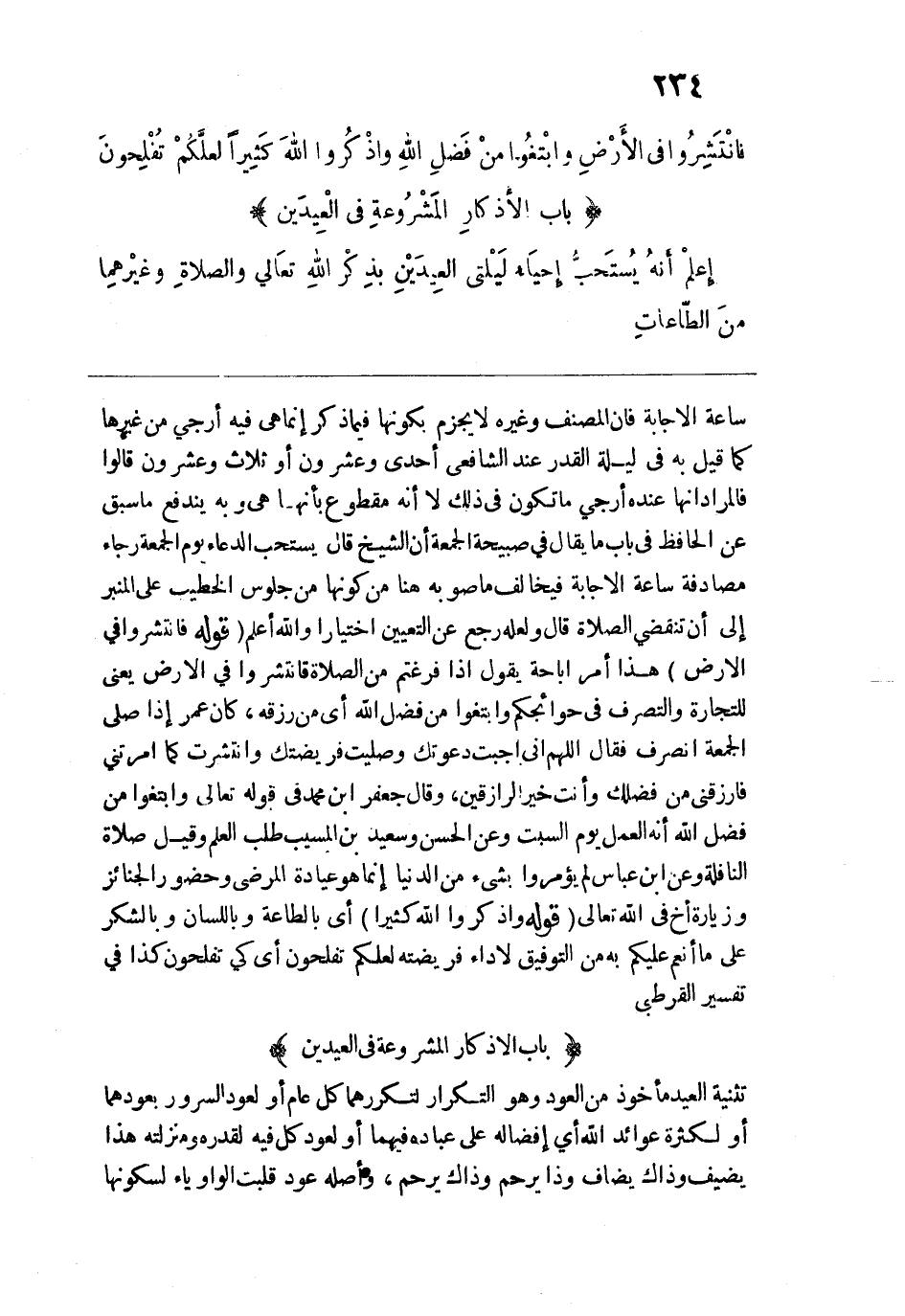 ساعة الإجابة فإن المصنف وغيره لا يجزم بكونها فيما ذكر إنما هي فيه أرجى من غيرها كما قيل به في ليلة القدر عند الشافعي إحدى وعشرون أو ثلاث وعشرون قالوا فالمراد إنها عندها أرجى ما تكون في ذلك لا أنه مقطوع بأنها هي وبه يندفع ما سبق عن الحافظ في باب ما يقال في صبيحة الجمعة أن الشيخ قال يستحب الدعاء يوم الجمعة رجاء مصادفة ساعة الإجابة فيخالف ما صوبه هنا من كونها من جلوس الخطيب على المنبر إلى أن تنقضي الصلاة قال ولعله رجع عن التعيين اختيارًا والله أعلم. قوله: (فانْتشِرُوا في الأَرْضِ) هذا أمر إباحة بقول إذا فرغتم من الصلاة فانتشروا في الأرض يعني للتجارة