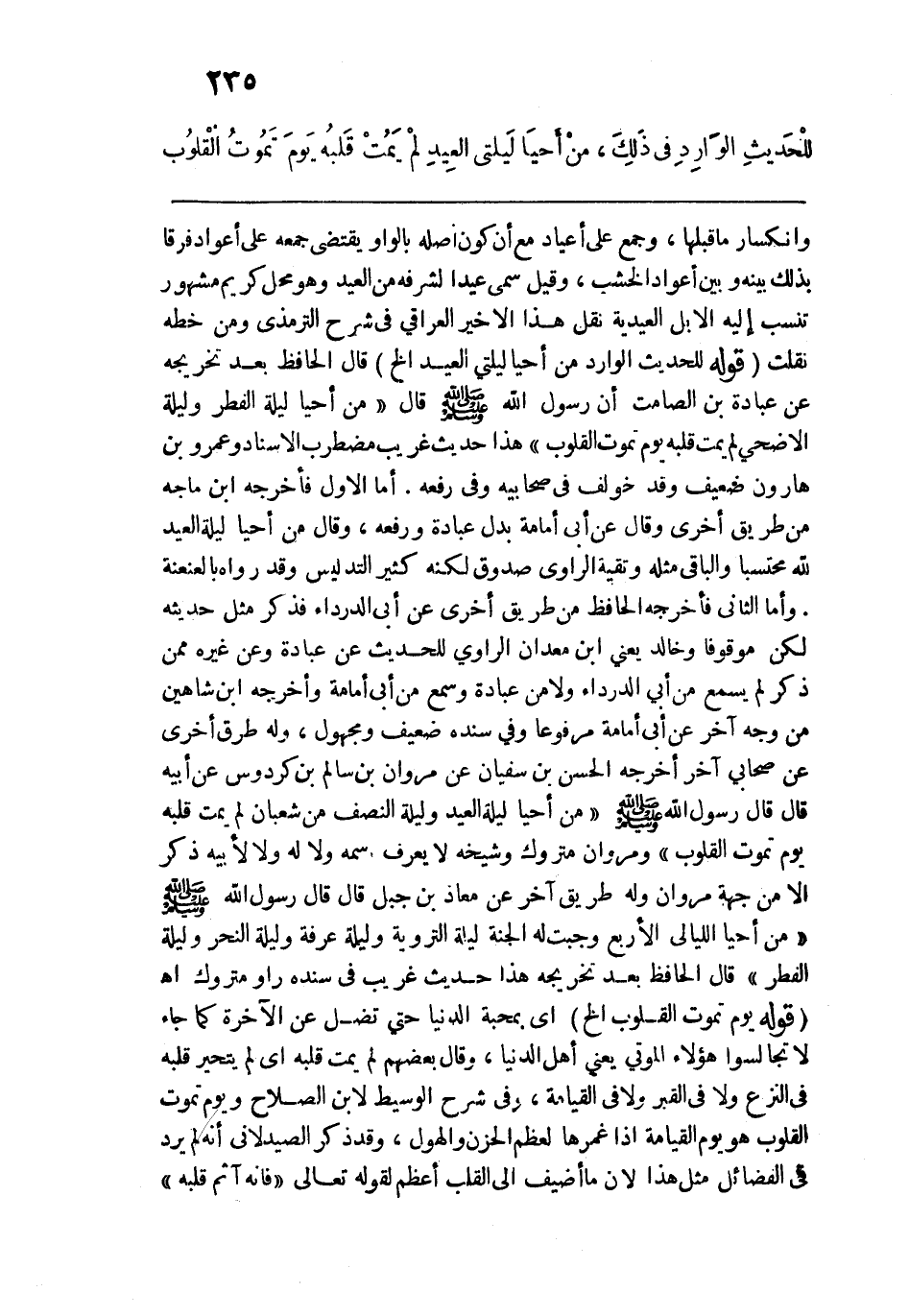 "مَنْ أحْيا لَيلَتي العِيدين، لَمْ يَمُتْ قَلْبُهُ يَوْمَ تَمُوتُ القُلُوبُ"