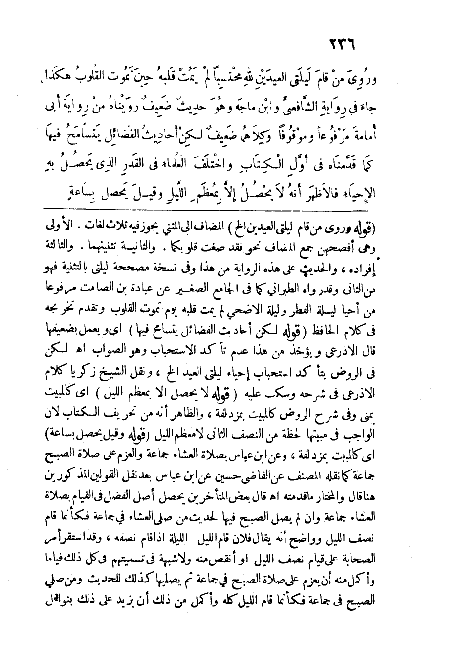 وروي: "مَنْ قامَ لَيْلَتي العِيدَيْنِ لِلهِ مُحْتَسِبًا لَمْ يَمُتْ قَلْبُهُ يومَ تَمُوتُ القُلُوبُ" هكذا جاء في رواية الشافعي وابن ماجه، وهو حديث ضعيف رويناه من رواية أبي أمامة مرفوعًا وموقوفا، وكلاهما ضعيف، لكن أحاديث الفضائل يتسامح فيها كما قدمناه في أوَّل الكتاب.