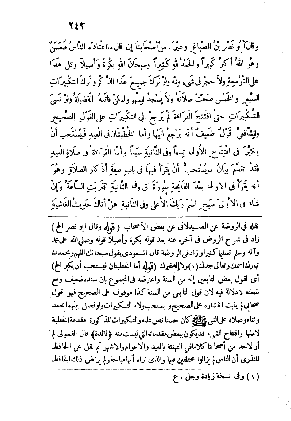 وقال أبو نصر بن الصباغ وغيره من أصحابنا: إن قال ما اعتاده النّاس، فحَسَن، وهو "اللهُ أكْبَر كَبِيرًا، والحَمْدُ لِلهِ كَثيرًا، وسُبْحَانَ الله بُكْرَةً وَأصِيلًا". وكل هذا على التوسعة، ولا حجر في شيء منه، ولو ترك جميع هذا الذكر، وترك التكبيرات السبع والخمس، صحت صلاته ولا يسجد للسهو، ولكن فاتته الفضيلة، ولو نسي التكبيرات حتى افتتح القراءة، لم يرجع إلى التكبيرات على القول الصحيح، وللشافعي قول ضعيف: إنه يرجع إليها. وأما الخطبتان في صلاة العيد، فيستحبُّ أن يكبر في افتتاح الأولى تسعًا، وفي الثانية سبعًا. وأما