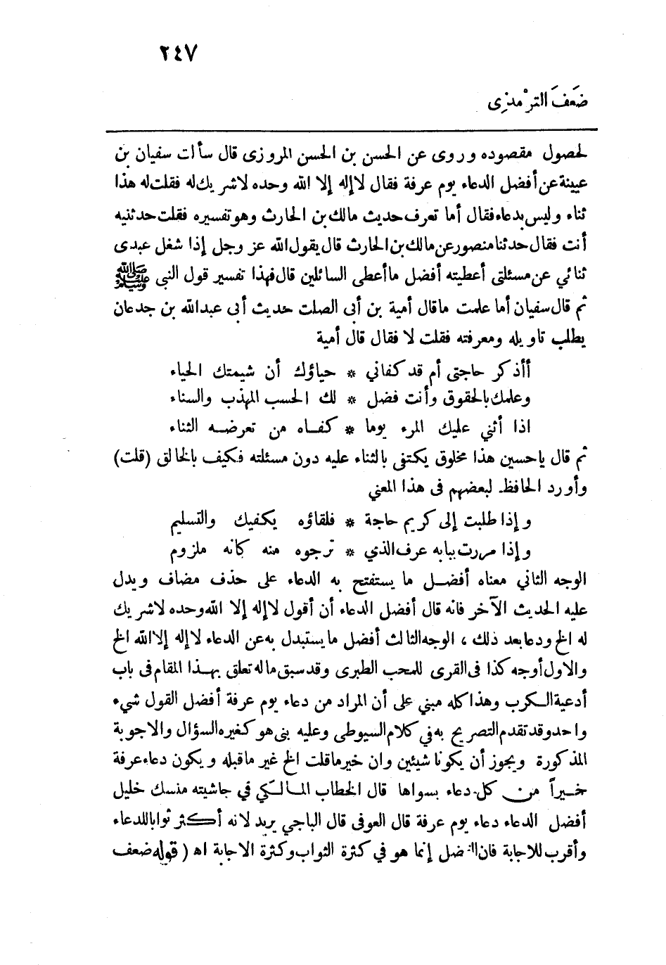 لحصول مقصوده وروي عن الحسن بن الحسن المروزي قال سالت سفيان بن عيينة عن أفضل الدعاء يوم عرفة فقال لا إله إلَّا الله وحده لا شريك له فقلت له هذا ثناء وليس بدعاء فقال أما تعرف حديث مالك بن الحارث وهو تفسيره فقلت حدثنيه أنت فقال حدثنا منصور عن مالك بن الحارث قال يقول الله عزّ وجل إذا شغل عبدي ثنائي عن مسألتي أعطيته أفضل ما أعطي السائلين قال فهذا تفسير قول النبي - صلى الله عليه وسلم - ثم قال سفيان أما علمت ما قال أمية بن أبي الصلت حديث أبي عبد الله بن جدعان يطلب تأويله ومعرفته فقلت لا فقال قال أمية: