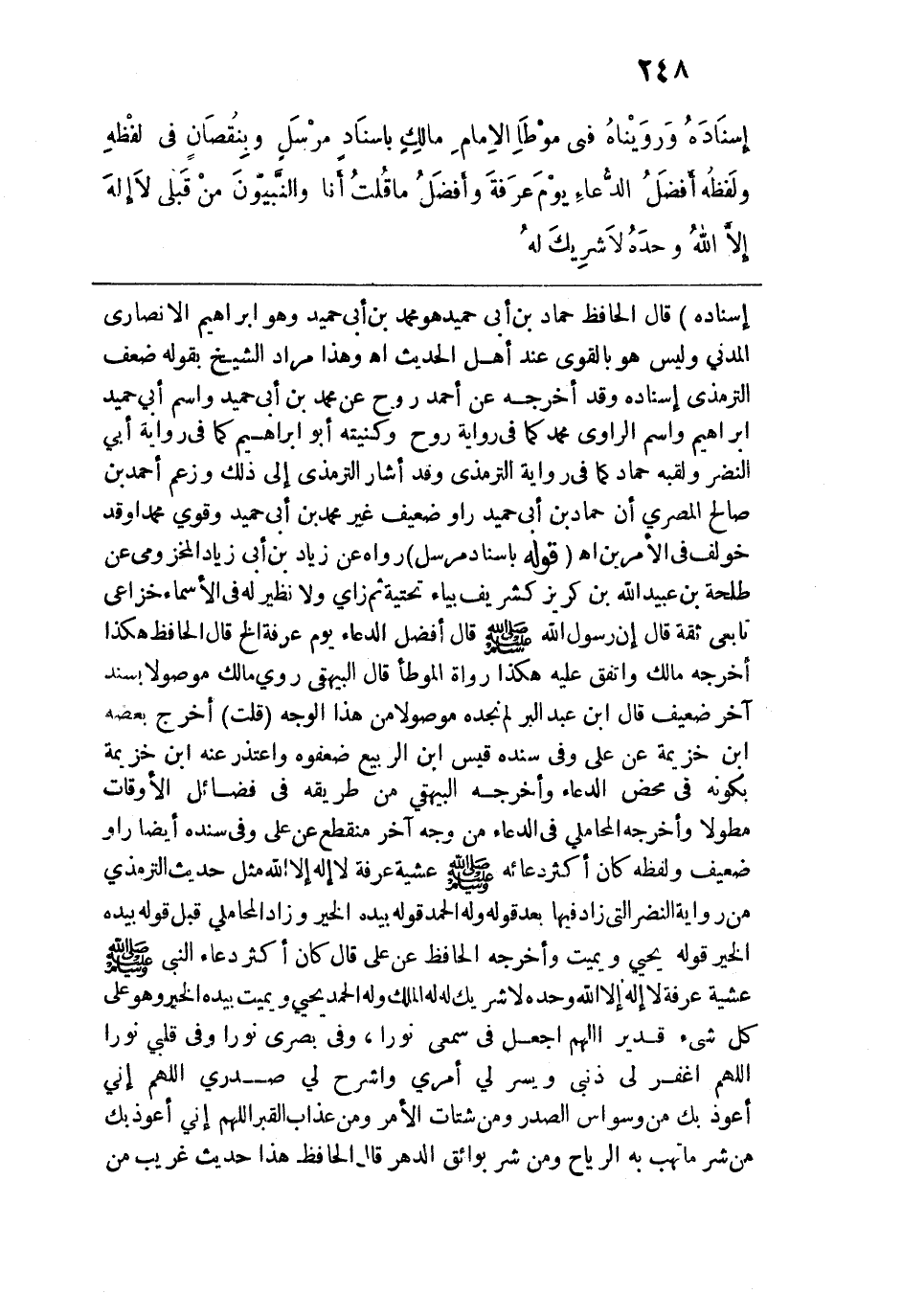 الترْمذِي إسنَادَهُ) قال الحافظ حماد بن أبي حميد هو محمد بن أبي حميد وهو إبراهيم الأنصاري المدني وليس هو بالقوي عند أهل الحديث اهـ، وهذا مراد الشيخ بقوله ضعف الترمذي إسناده وقد أخرجه عن أحمد روح عن محمد بن أبي حميد واسم أبي حميد إبراهيم واسم الراوي محمد كما في رواية روح وكنيته أبو إبراهيم كما في رواية أبي النضر ولقبه حماد كما في رواية الترمذي وقد أشار الترمذي إلى ذلك وزعم أحمد بن صالح المصري أن حماد بن أبي حميد راو ضعيف غير محمد بن أبي حميد وقوي محمدًا وقد خولف في الأمرين اهـ. قوله: (بإِسنَاد مرْسَلٍ) رواه عن زياد بن أبي زياد المخزومي عن طلبة بن عبيد الله بن كريز كشريف بياء تحتية ثم زاي ولا نظير له في الأسماء خزاعي تابعي ثقة قال إن رسول الله - صلى الله عليه وسلم - قال أفضل الدعاء يوم عرفة الخ. قال الحافظ هكذا أخرجه مالك واتفق عليه هكذا رواة الموطأ قال البيهقي روى مالك موصولًا بسند آخر ضعيف قال ابن عبد البر لم نجده موصولًا من هذا الوجه (قلت) أخرج بعضه ابن خزيمة عن علي وفي سنده قيس بن الربيع ضعفوه واعتذر عنه ابن خزيمة بكونه في محض الدعاء وأخرجه البيهقي من طريقه في فضائل الأوقات مطولًا وأخرجه المحاملي في الدعاء من وجه آخر منقطع عن علي وفي سنده أيضًا راو ضعيف ولفظه كان أكثر دعائه - صلى الله عليه وسلم - عشية عرفة لا إله إلَّا الله مثل حديث الترمذي من رواية النضر التي زاد فيها بعد قوله وله الحمد قوله بيده الخير وزاد المحاملي قبل قوله بيده الخير قوله يحيي ويميت وأخرجه الحافظ عن علي قال كان أكثر دعاء النبي - صلى الله عليه وسلم - عشية عرفة لا إله إلَّا الله وحده لا شريك له له الملك وله الحمد يحيي ويميت بيده الخير وهو على كل شيء قدير اللهم اجعل في سمعي نورًا، وفي بصري نورًا وفي قلبي نورًا اللهم اغفر لي ذنبي ويسر لي أمري واشرح لي صدري اللهم إني أعوذ بك من وسواس الصدر ومن شتات الأمر ومن عذاب القبر اللهم إني أعوذ بك من شر ما تهب به الرياح ومن شر بوائق الدهر قال الحافظ هذا حديث غريب من