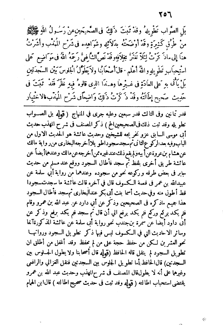 قوله: (قَال أَصْحَابُنا ولا يطوِّل الجُلوسَ بَيْن السجدَتينِ) قال الحافظ أما تطويل الجلوس بين السجدتين فنقل الغزالي والرافعي وغيرهما على أنه لا يطول قال المصنف في شرح المهذب وحديث عبد الله بن عمرو يقتضي استحباب إطالته. قوله: (وقَدْ ثَبَتَ في حَدِيث صَحيح إِطَالتُه) قال ابن الهمام