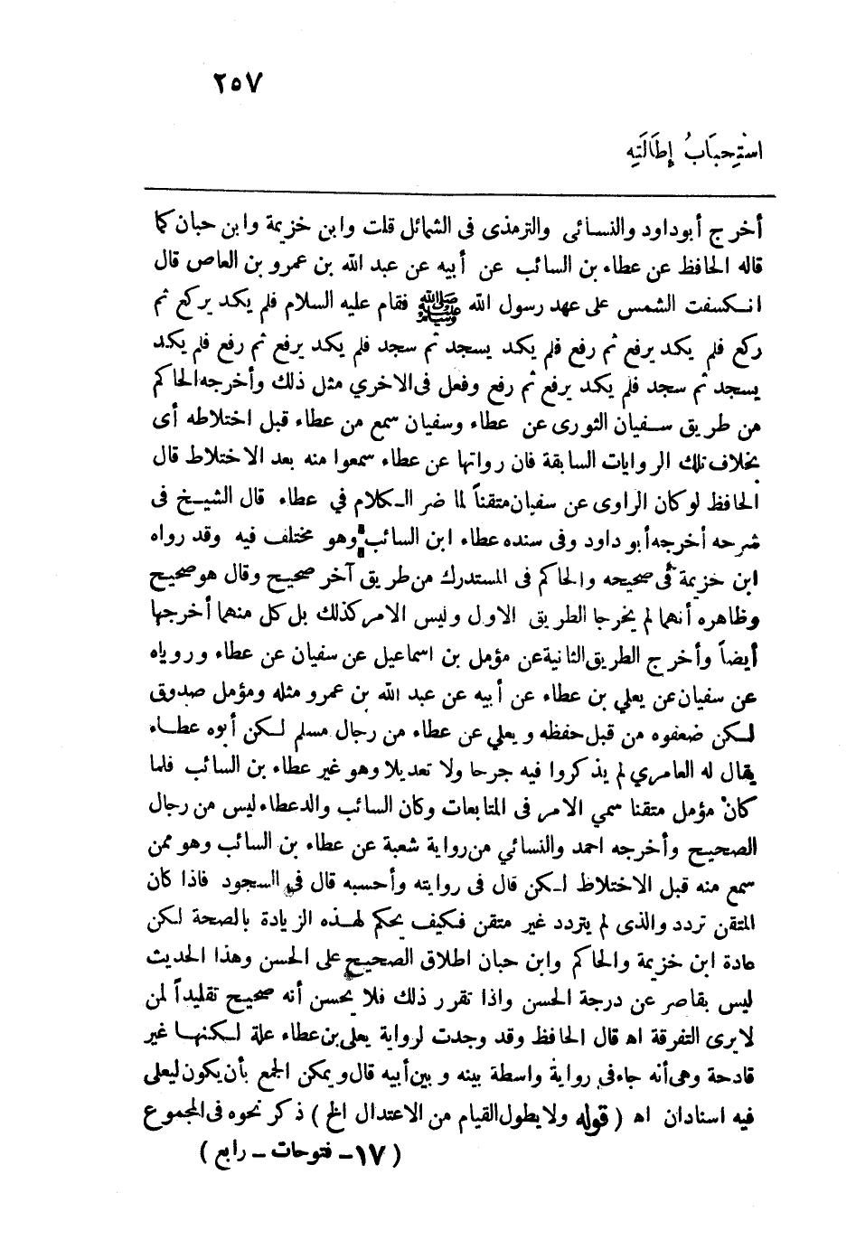 أخرج أبو داود والنسائي والترمذي في الشمائل قلت وابن خزيمة وابن حبان كما قاله الحافظ عن عطاء بن السائب عن أبيه عن عبد الله بن عمرو بن العاص قال انكسفت الشمس على عهد رسول الله - صلى الله عليه وسلم - فقام - عليه السلام - فلم يكد يركع ثم ركع فلم يكد يرفع ثم رفع فلم يكد يسجد ثم سجد فلم يكد يرفع ثم رفع فلم يكد يسجد ثم سجد فلم يكد يرفع ثم رفع وفعل في الأخرى مثل ذلك وأخرجه الحاكم من طريق سفيان الثوري عن عطاء وسفيان سمع من عطاء قبل اختلاطه أي بخلاف تلك الروايات السابقة فإن رواتها عن عطاء سمعوا منه بعد الاختلاط قال الحافظ لو كان الراوي عن سفيان متقنًا لما ضر الكلام في عطاء قال الشيخ في شرحه أخرجه أبو داود وفي سنده عطاء بن السائب وهو مختلف فيه وقد رواه ابن خزيمة في صحيحه والحاكم في المستدرك من طريق آخر صحيح وقال هو صحيح وظاهره أنهما لم يخرجا الطريق الأول وليس الأمر كذلك بل كل منهما أخرجها أيضًا وأخرج الطريق الثانية عن مؤمل بن إسماعيل عن سفيان عن عطاء وروياه عن سفيان عن يعلى بن عطاء عن أبيه عن عبد الله بن عمرو مثله ومؤمل صدوق لكن ضعفوه من قبل حفظه ويعلى عن عطاء من رجال مسلم لكن أبو عطاء يقال له العامري لم يذكروا فيه جرحا ولا تعديلا وهو غير عطاء بن السائب فلما كان مؤمل متقنًا سمي الأمر في المتابعات وكان السائب والد عطاء ليس من رجال الصحيح وأخرجه أحمد والنسائي من رواية شعبة عن عطاء بن السائب وهو ممن سمع منه قبل الاختلاط لكن قال في روايته وأحسبه قال في السجود فإذا كان المتقين تردد والذي لم يتردد غير متقن فكيف يحكم لهذه الزيادة بالصحة لكن عادة ابن خزيمة والحاكم وابن حبان إطلاق الصحيح على الحسن وهذا الحديث ليس بقاصر عن درجة الحسن وإذا تقرر ذلك فلا يخسن أنه صحيح تقليدًا لمن لا يرى التفرقة اهـ. قال الحافظ وقد وجدت لرواية يعلى بن عطاء علة لكنها غير قادحة وهي أنه جاء في رواية واسطة بينه وبين أبيه قال ويمكن الجمع بأن يكون ليعلى فيه اسنادان اهـ. قوله: (ولا يُطَوِّلُ القيام من الاعِتدالِ الخ) ذكر نحوه في المجموع
