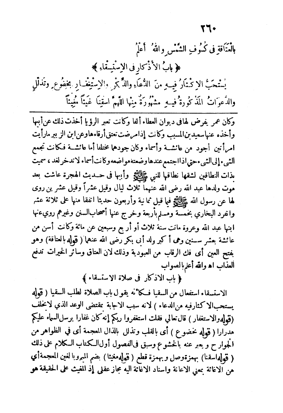 الاستسقاء استفعال من السقيا فكأنه يقول باب الصلاة لطلب السقيا قوله: (يُسْتحَبُّ الإِكثار فِيهِ مِن الدُّعَاءِ) لأنه سبب الإجابة بمقتضى الوعد الذي لا يخلف. قوله: (والاسْتِغفارِ) قال تعالى فقلت {فَقُلْتُ اسْتَغْفِرُوا رَبَّكُمْ إِنَّهُ كَانَ غَفَّارًا} {يُرْسِلِ السَّمَاءَ عَلَيْكُمْ مِدْرَارًا} [نوح: 11، 10] ". قوله: (بخُضُوع) أي بالقلب وتذلل بالذال المعجمة أي في الظواهر من الجوارح وبعبر عنه بالخشوع وسبق في الفصول أول الكتاب الكلام على ذلك. قوله: (اسقِنَا) بهمزة وصل وبهمزة قطع. قوله: (مُغِيثًا) بضم الميم وبالغين المعجمة أي من الإغاثة بمعنى الإعانة وإسناد الإغاثة إليه مجاز عقلي إذ المغيث على الحقيقة هو