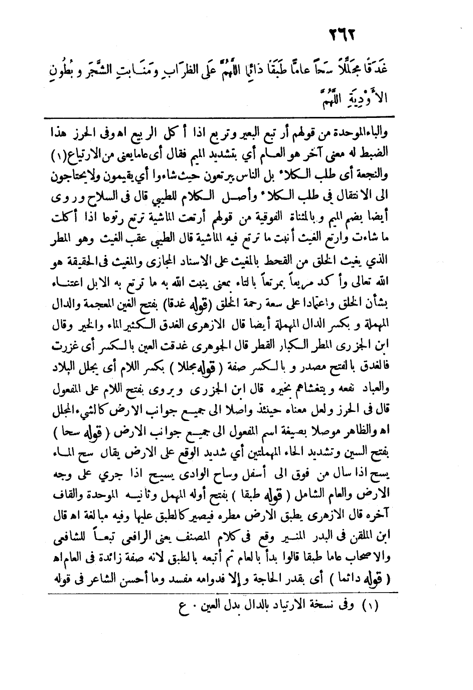 والباء الموحدة من قولهم ارتبع البعير وتربع إذا أكل الربيع اهـ، وفي الحرز هذا الضبط له معنى آخر هو العام أي بتشديد الميم فقال أي عاما يعني من الارتياع والنجعة أي طلب الكلام بل النّاس يرتعون حيث شاؤوا أي يقيمون ولا يحتاجون إلى الانتقال في طلب الكلام بل النّاس يرتعون حيث شاؤوا أي يقيمون ولا يحتاجون إلى الانتقال في طلب الكلام وأصل الكلام للطيبي قال في السلاح وروي أيضًا بضم الميم وبالمثناة الفوقية من قولهم ارتعت المشاية ترتع رتوعا إذا أكلت ما شاءت وارتع الغيث أثبت ما ترتفع فيه الماشية قال الطيبي عقب الغيث وهو المطر الذي يغيث الخلق من القحط بالمغيث على الإسناد المجازي والمغيث في الحقيقة هو الله تعالى وأكد مريعا بمرتعا بالتاء بمعنى ينبت الله به ما ترتفع به الإبل اعتناء بشأن الخلق واعتمادا على سعة رحمة الخلق. قوله: (غَدَقًا) بفتح الغين المعجمة والدال المهملة وبكسر الدال المهملة أيضًا قال الأزهري الغدق الكثير الماء والخير وقال ابن الجزري المطر الكبار القطر قال الجوهري غدقت العين بالكسر أي غزرت فالغدق بالفتح مصدر وبالكسر صفة. قوله: (مجلِّلا) بكسر السلام أي يجلل البلاد والعباد نفعه ويتغشاهم بخيره قال ابن الجزري ويروى بفتح اللام على المفعول قال في الحرز ولعل معناه